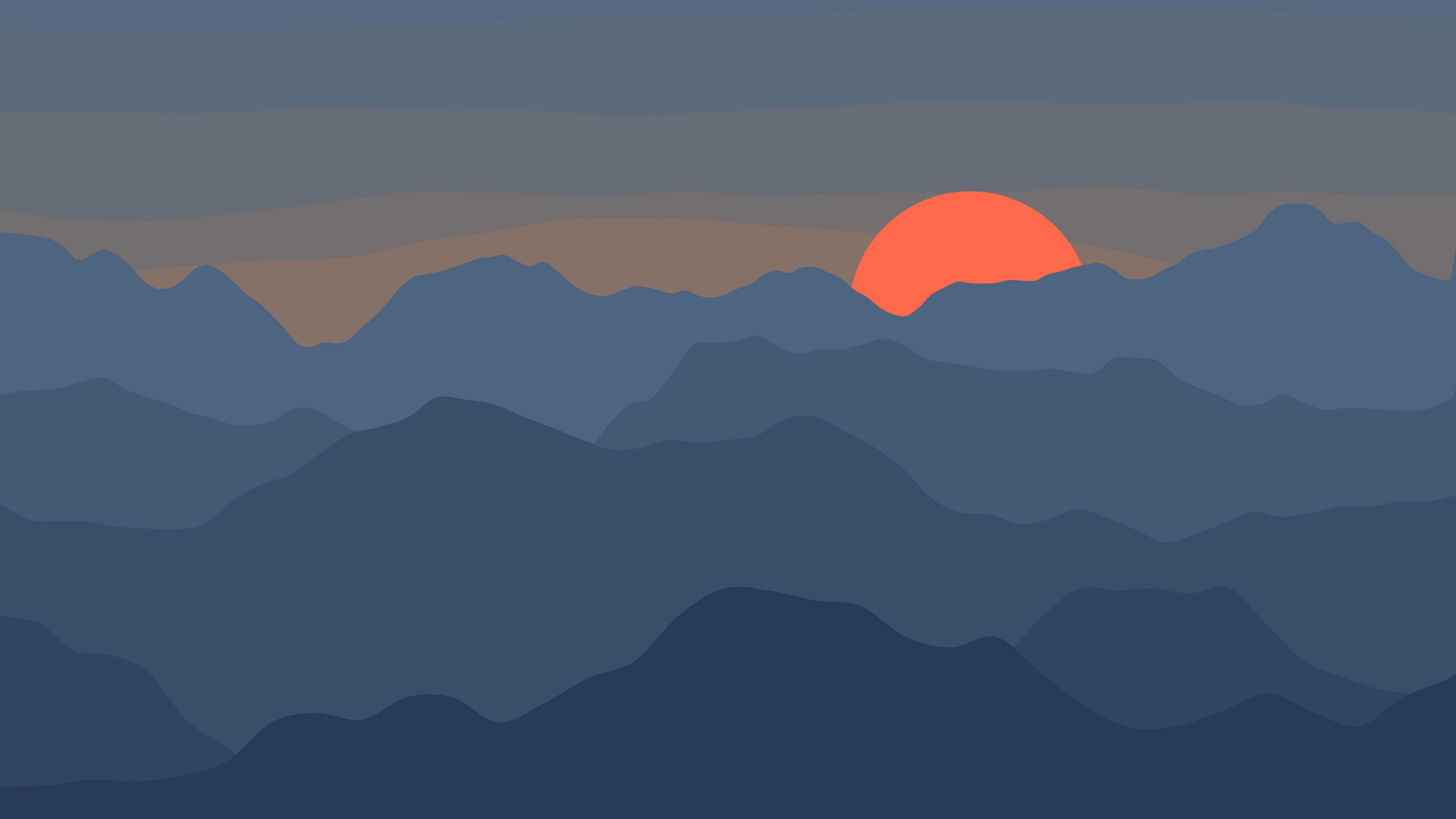 Description: A sunset over a mountain range with a red sun in the distance and a dark blue sky with clouds.