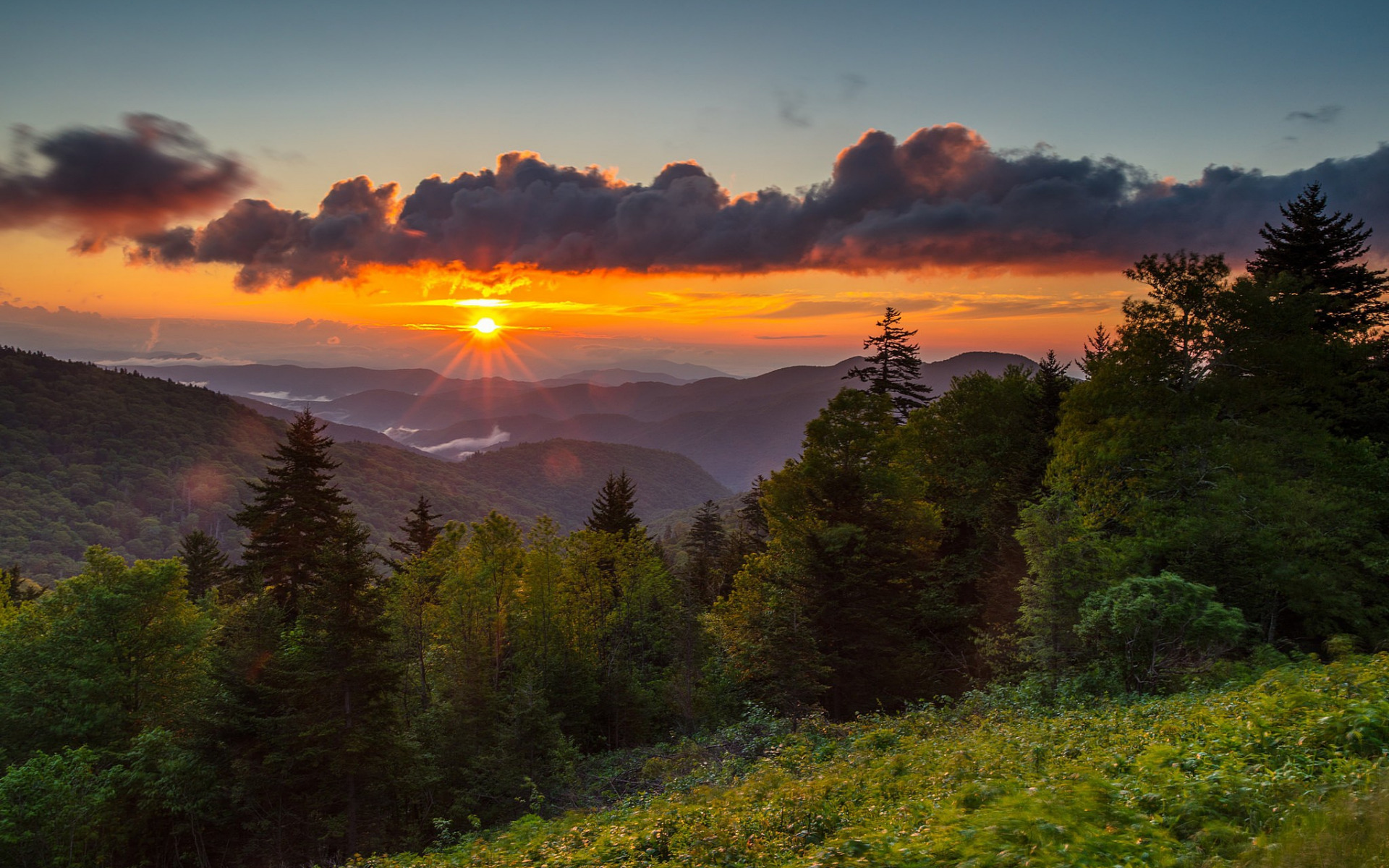 Description: A sunset over a mountain range with trees and bushes in the foreground and a few clouds in the sky.