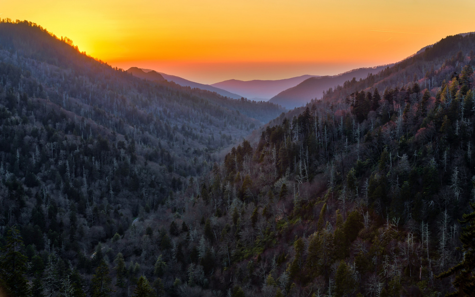Description: A sunset view of a mountain range with trees in the foreground and a forest in the background with a yellow sky.