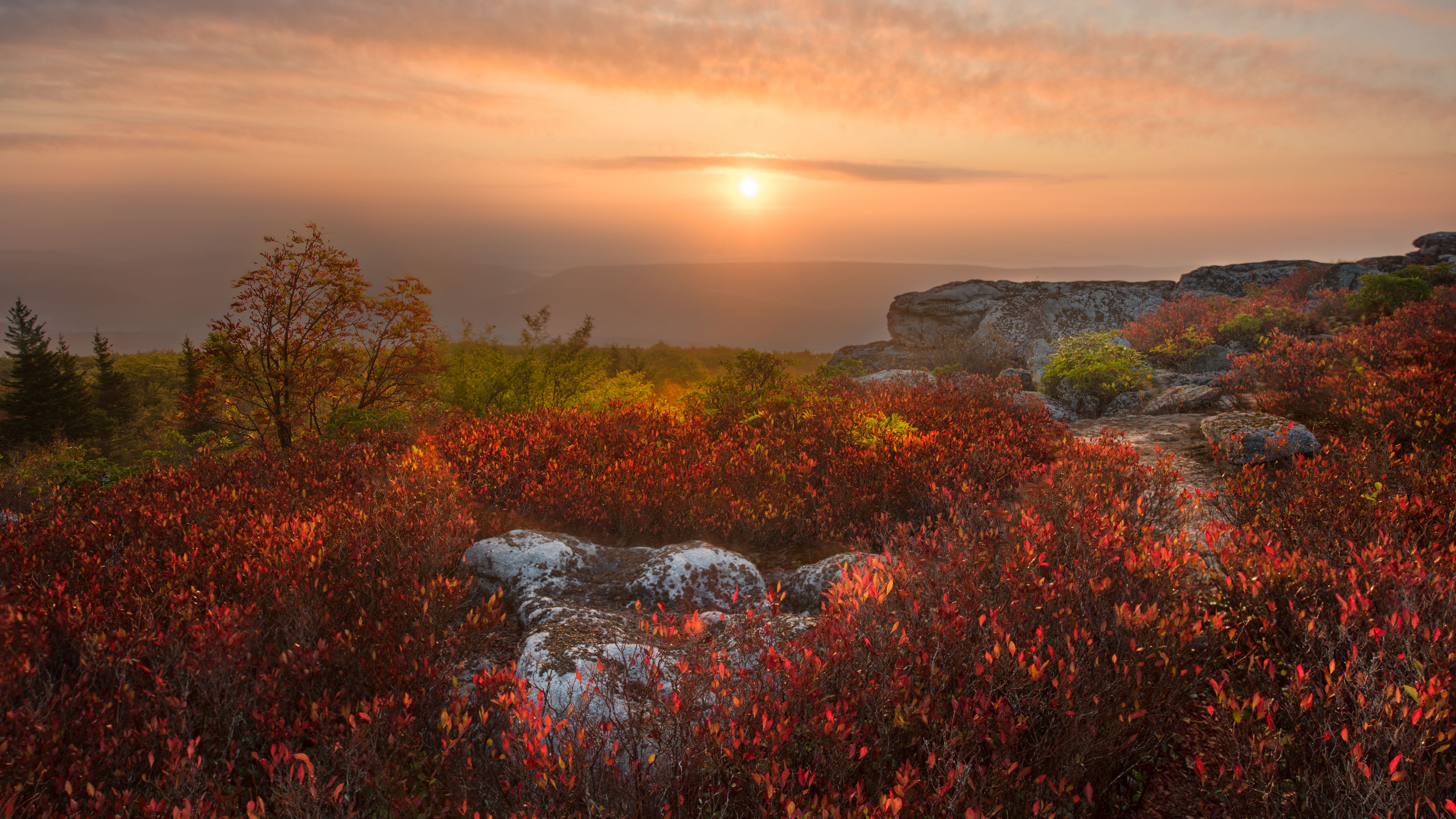 Description: A sunset over a rocky mountain with red bushes and trees in the foreground and a foggy sky.