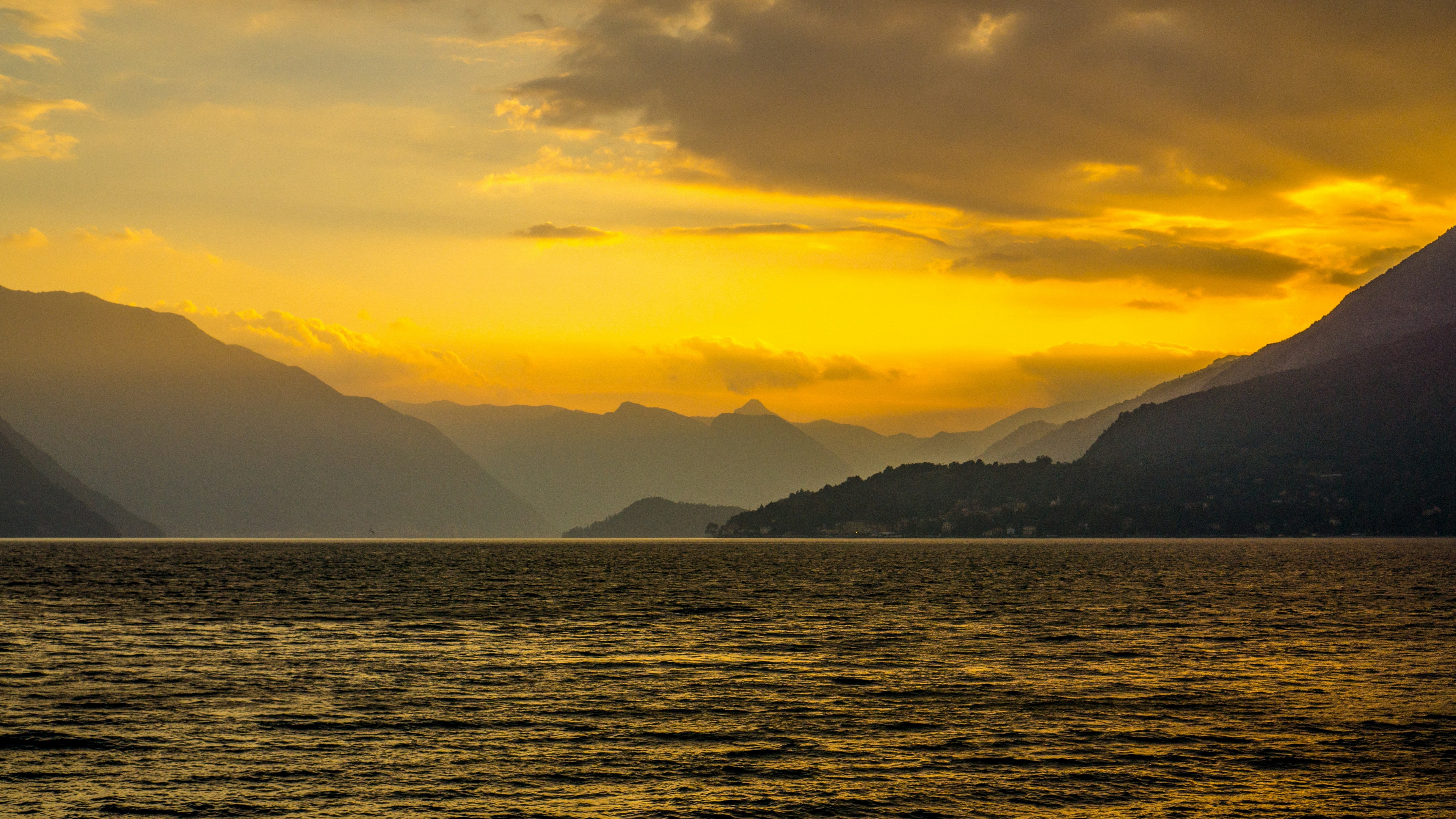 Description: A boat is out on the water at sunset with mountains in the background and a yellow sky with clouds.