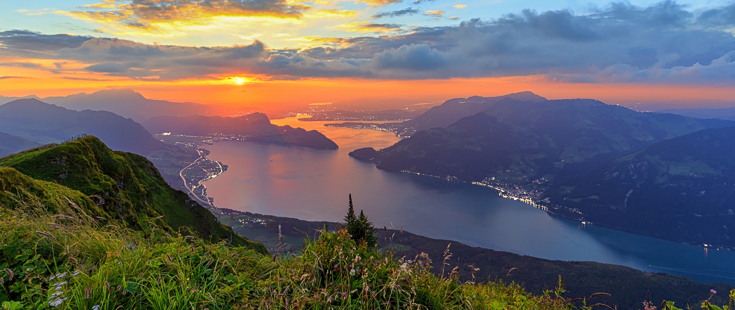Description: A sunset over a mountain with a lake and mountains in the background and a few clouds in the sky.
