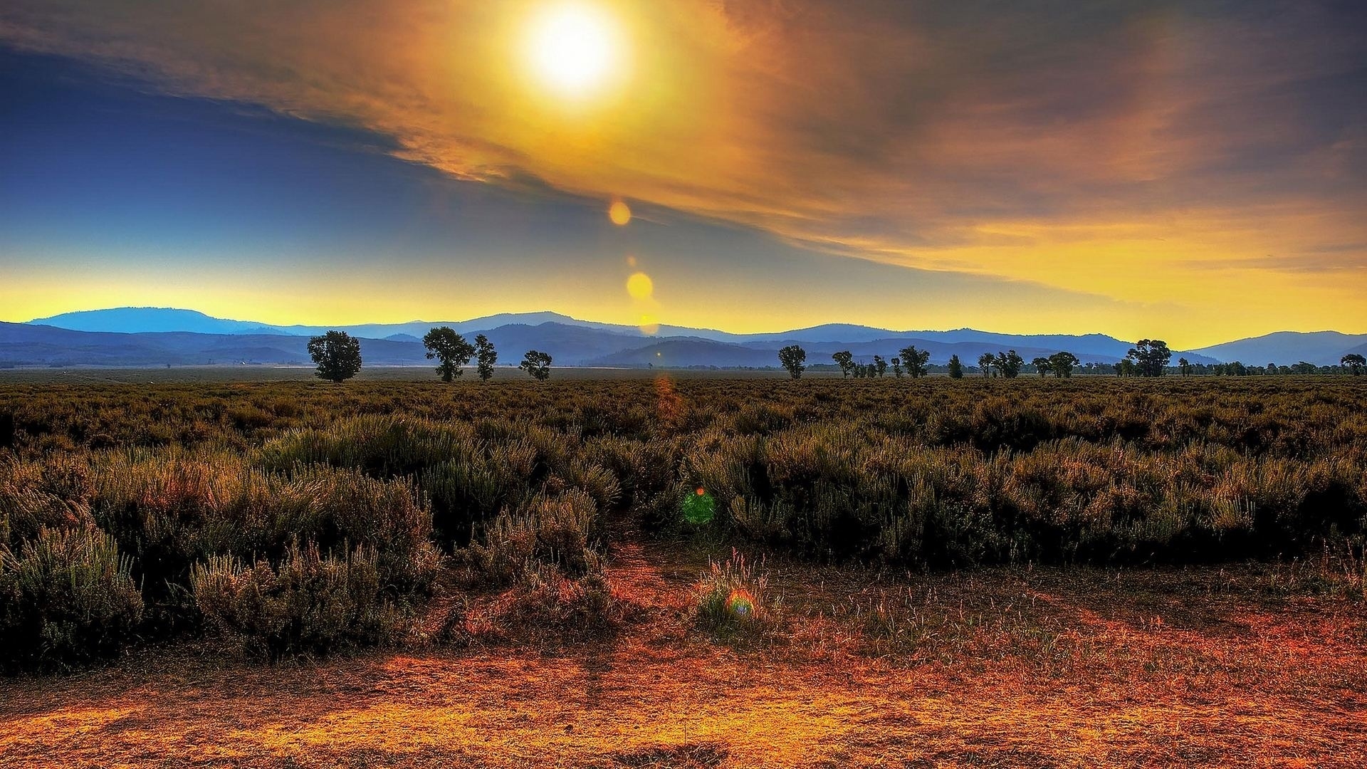 Description: A field with a sun in the sky and mountains in the background with a yellow and blue sky and a few clouds.