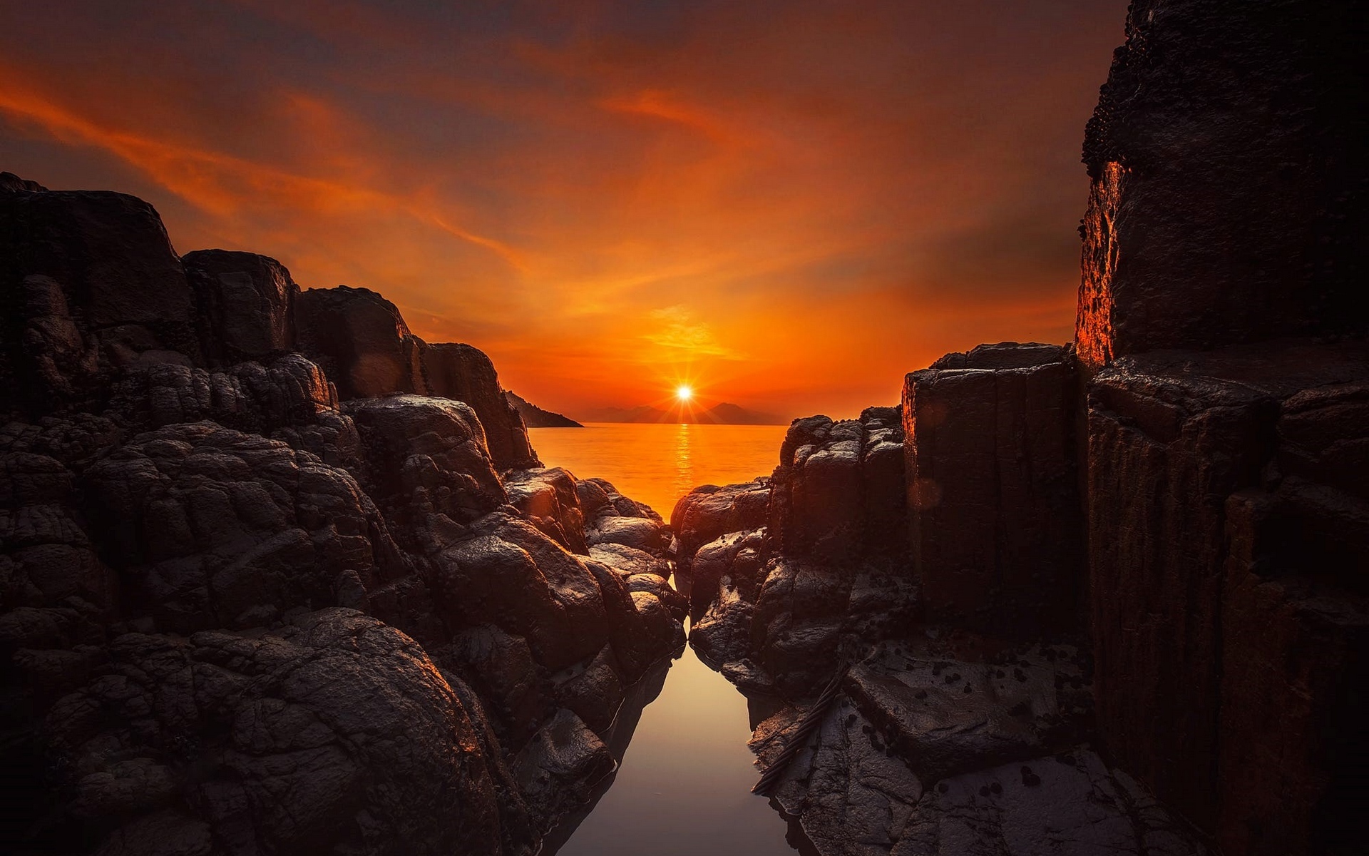 Description: A sunset over a body of water with rocks in the foreground and a small boat in the distance.