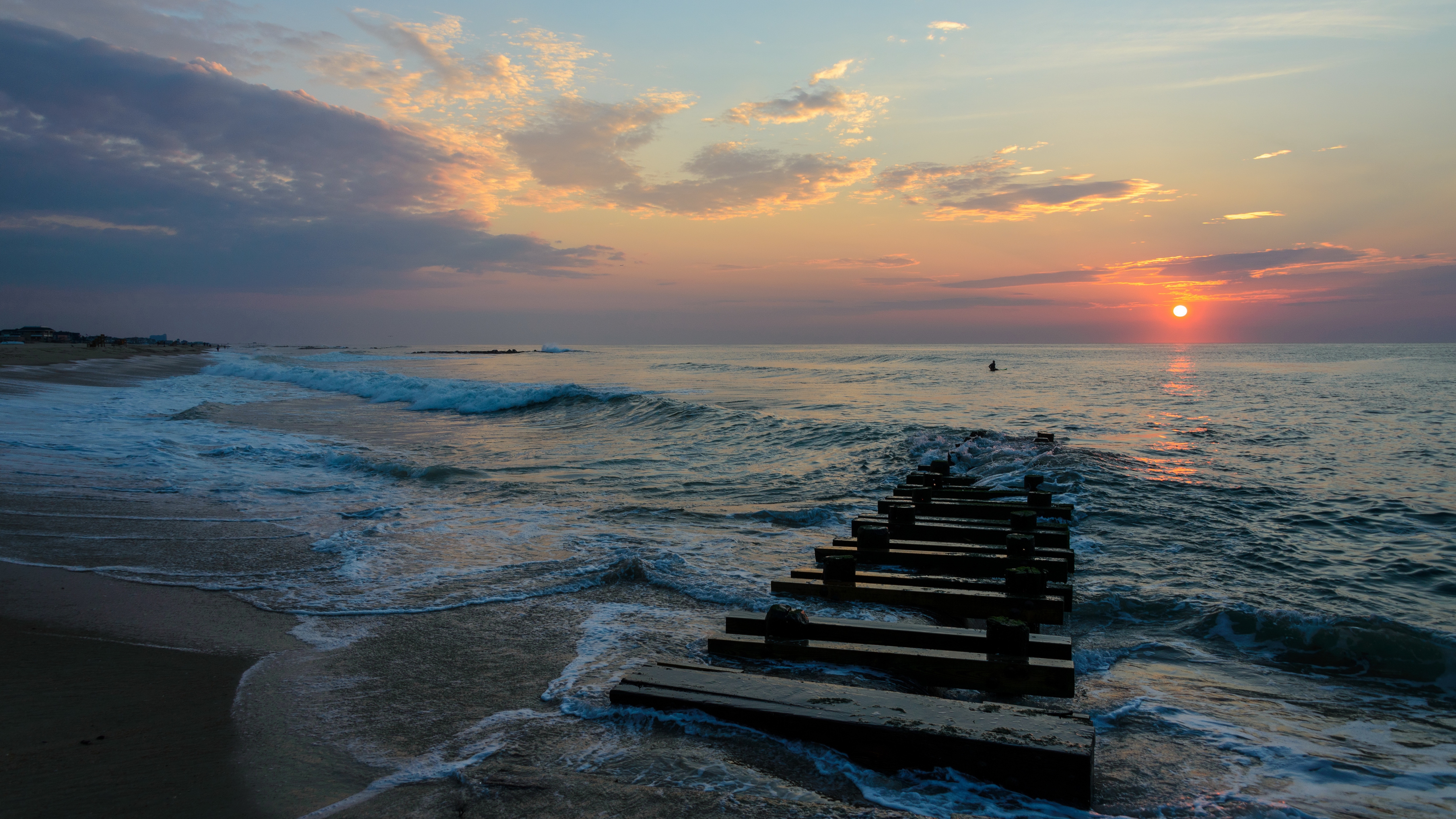 Description: A sunset over the ocean with a row of benches in the foreground and a person in the distance.