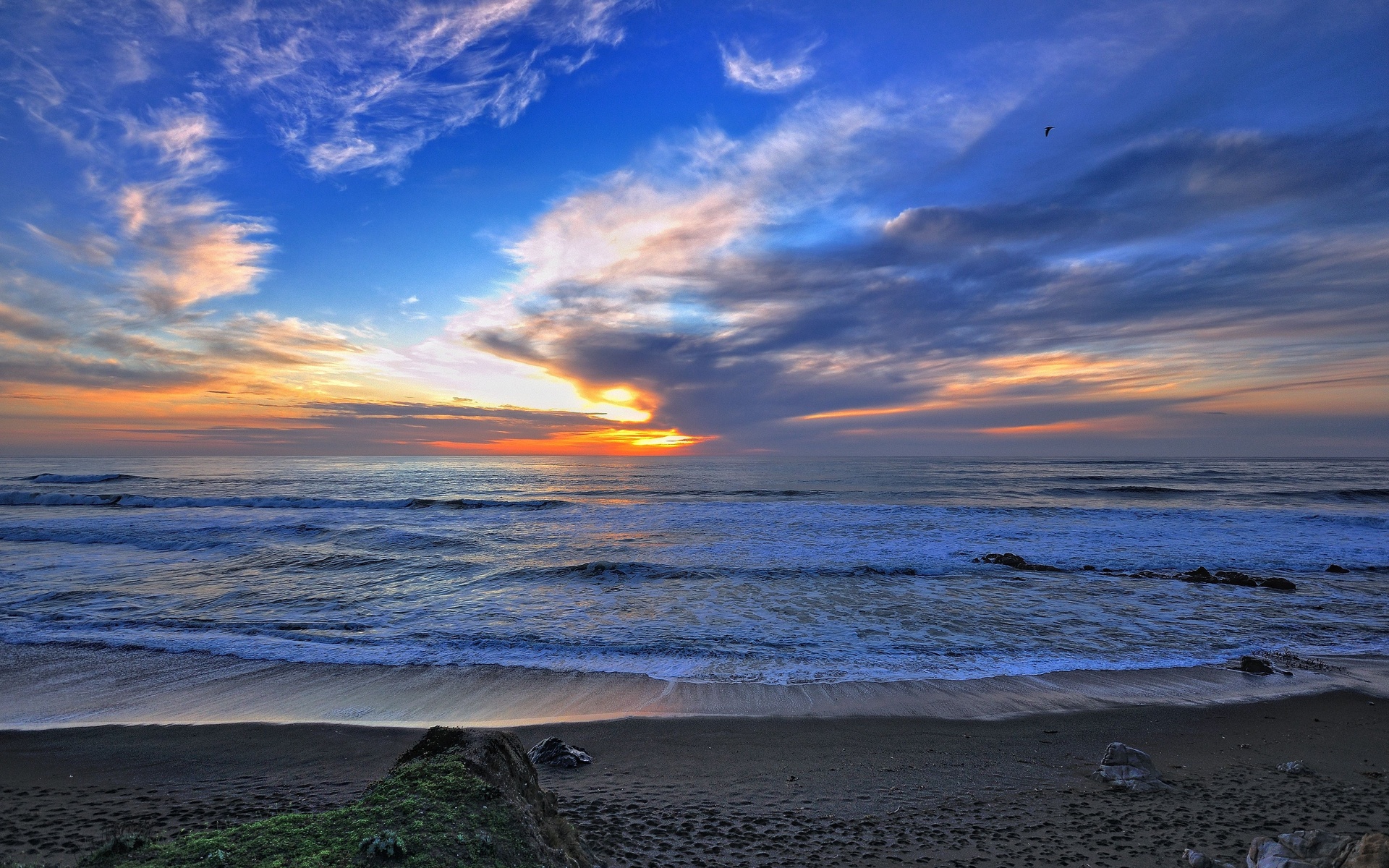 Description: A sunset over the ocean with a bird flying in the sky above it and a beach with waves and rocks.
