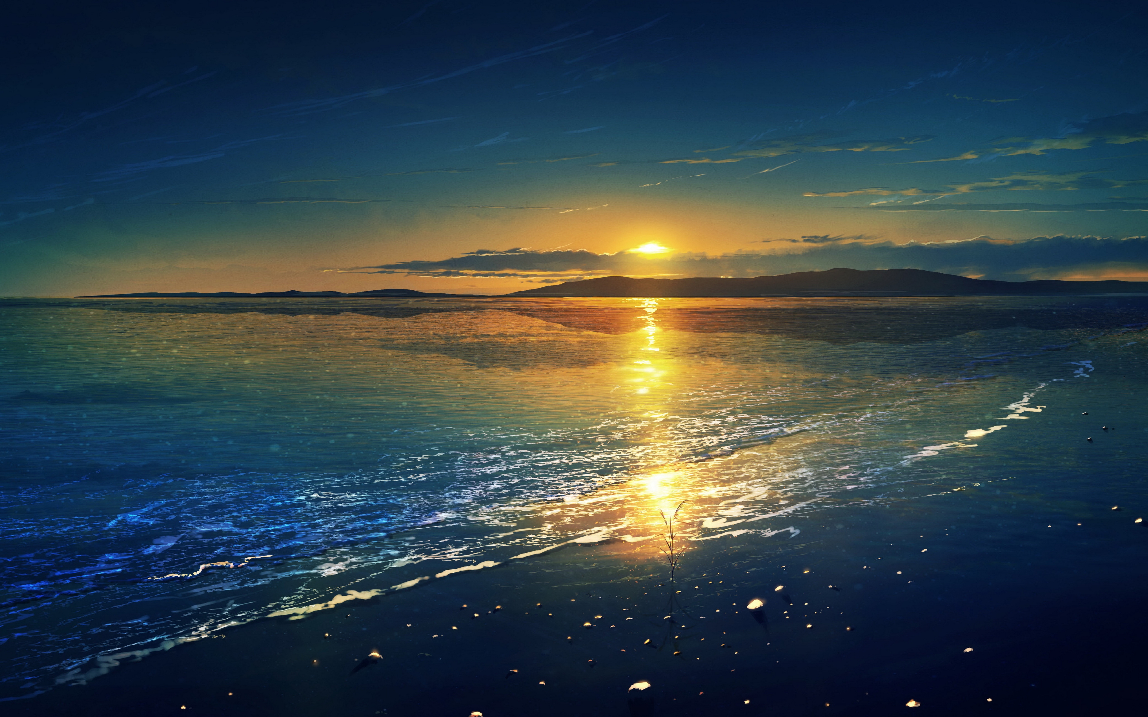 Description: A sunset over the ocean with a boat in the water and a mountain in the distance with a bright sun.
