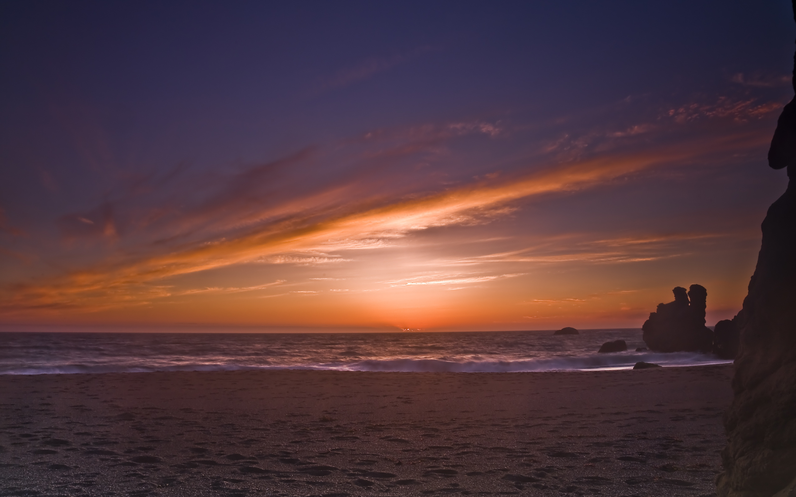 Description: A sunset over the ocean with a couple sitting on a rock looking out at the ocean and a person standing on the beach.