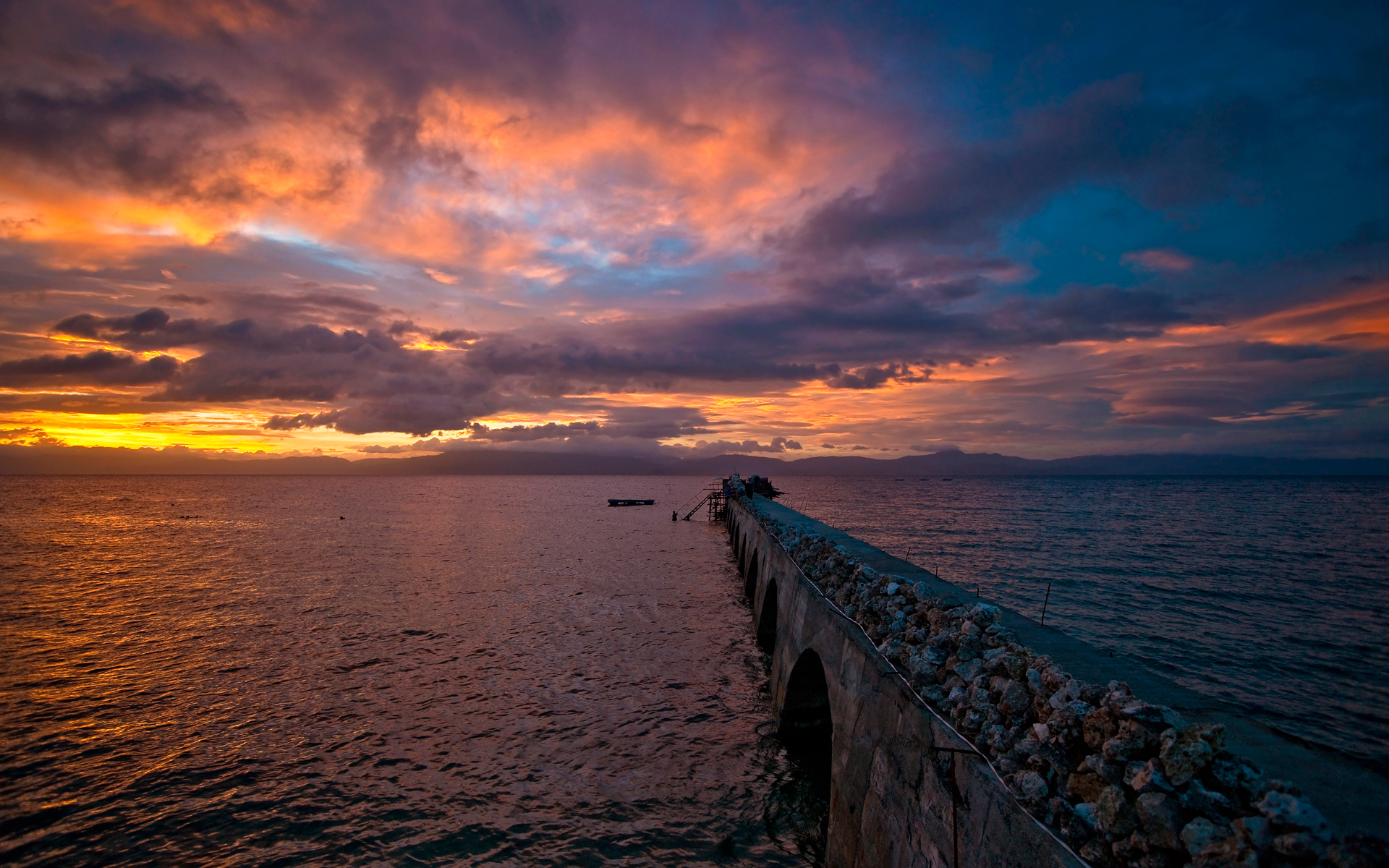 Description: A sunset over the ocean with a pier and a boat in the water and clouds in the sky above.