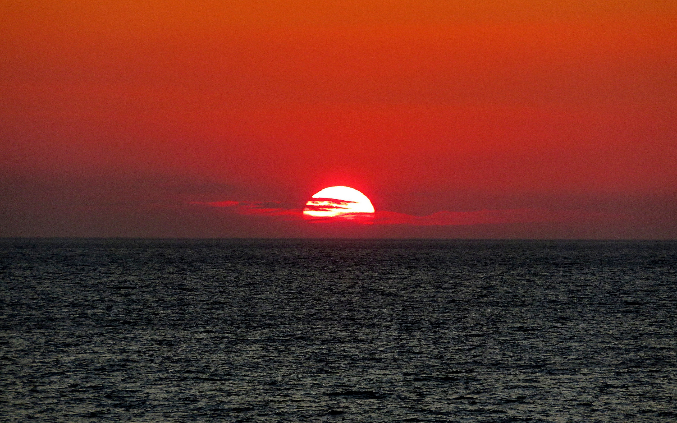 Description: A sunset over the ocean with a red sky and a sun setting in the distance with a boat in the water.