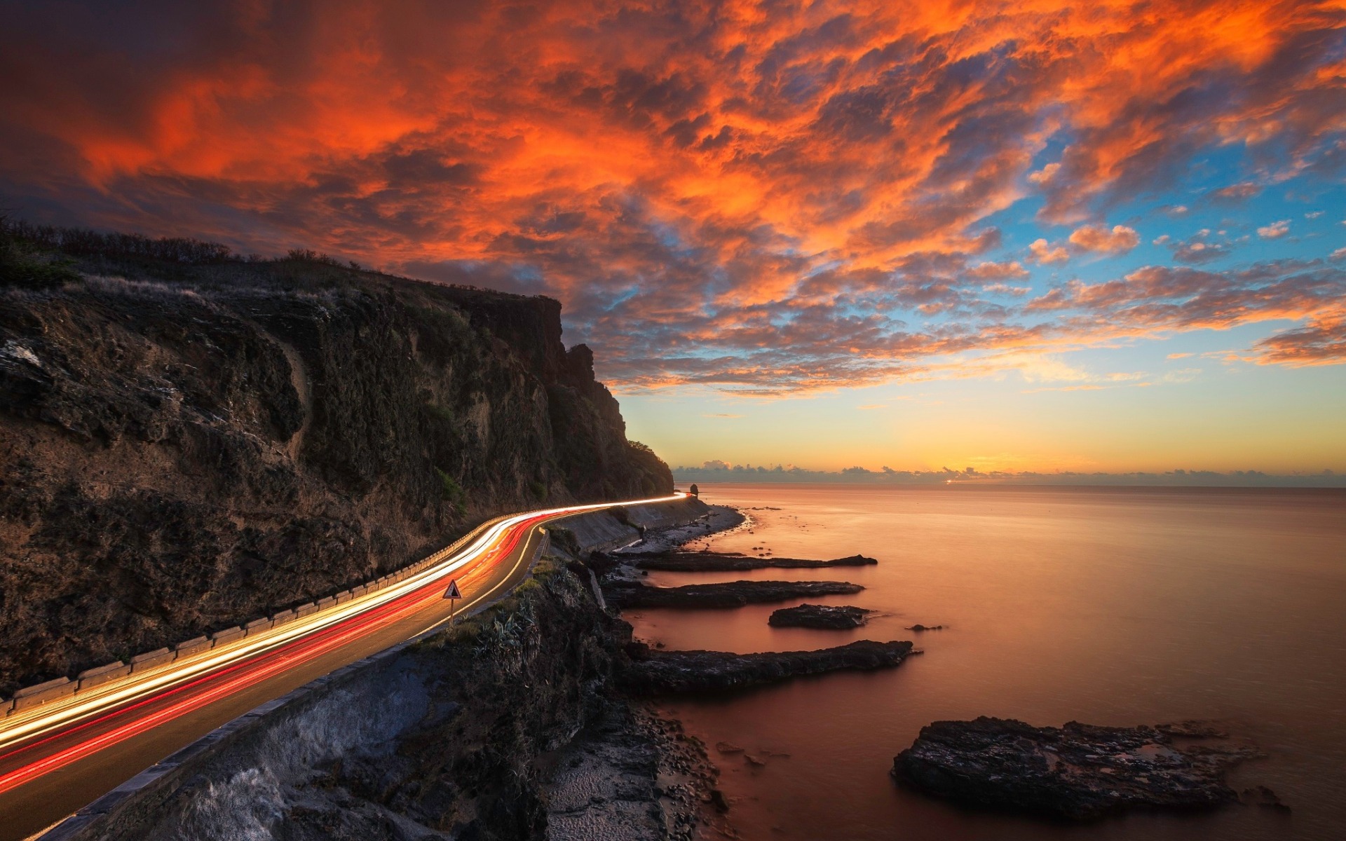 Description: A long exposure shot of a sunset over a road by the ocean with a long exposure of a car going down the road.