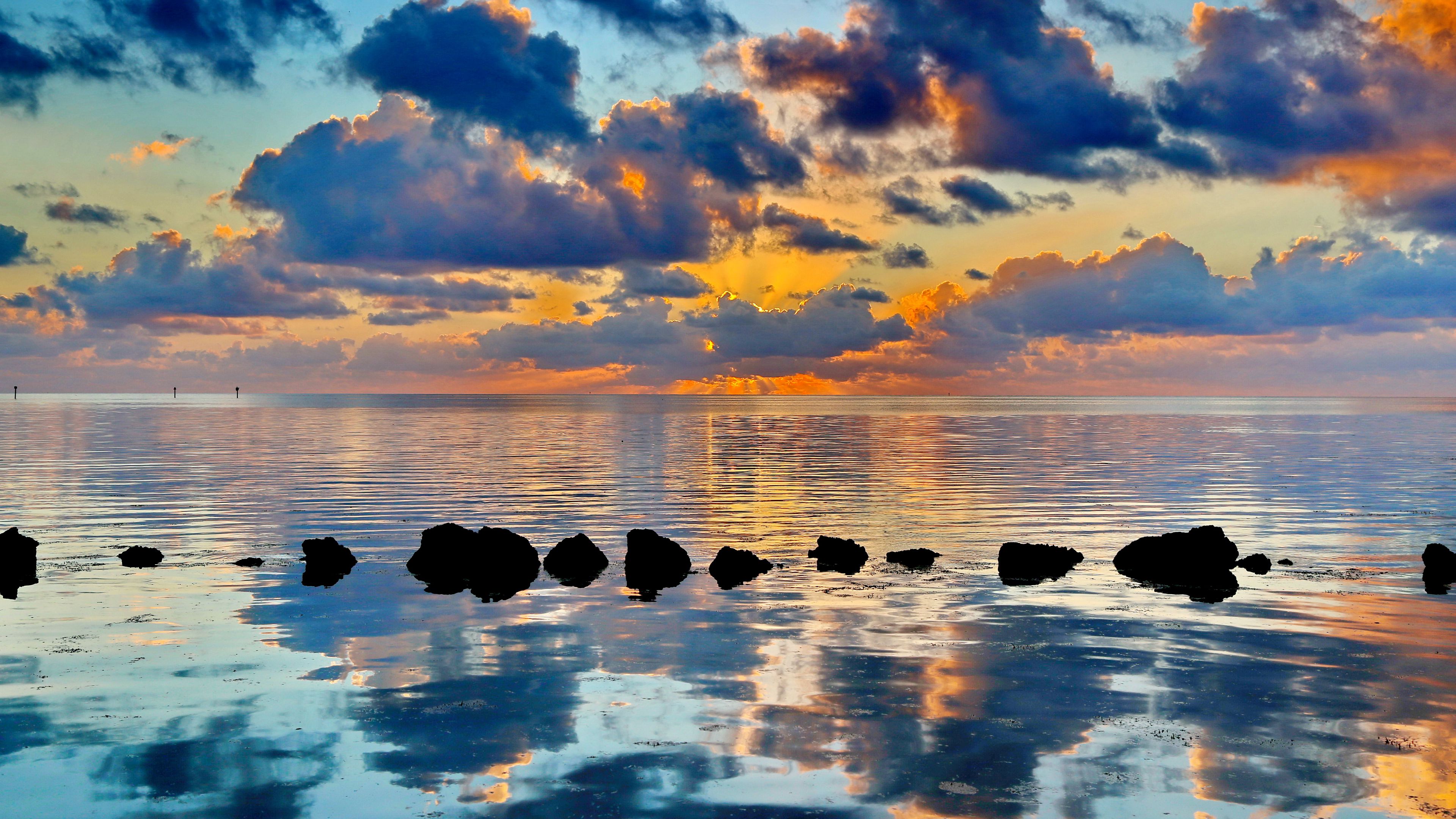 Description: A sunset over the ocean with rocks in the water and clouds in the sky above it and a few rocks in the water.