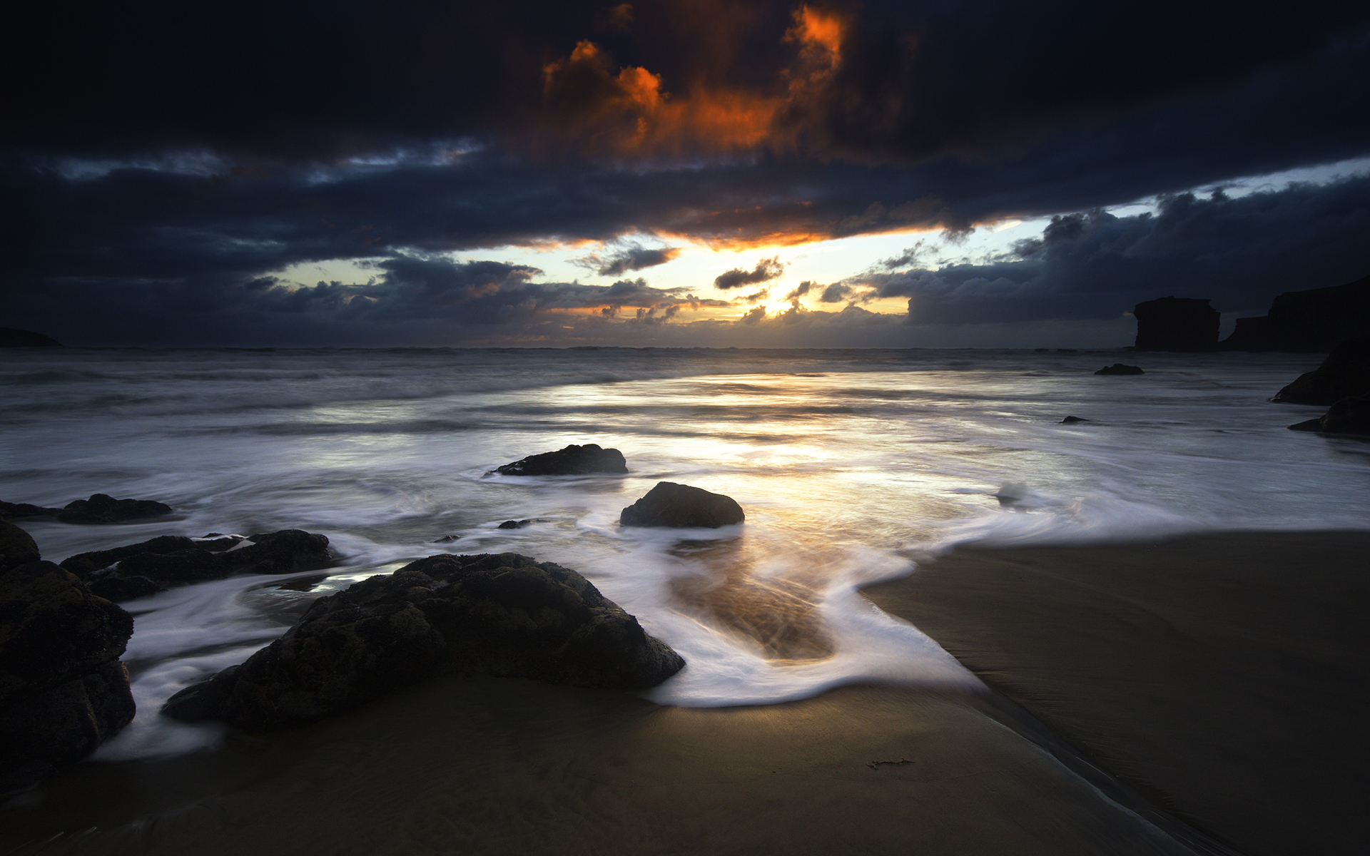 Description: A sunset over the ocean with rocks in the foreground and a dark sky in the background with clouds.
