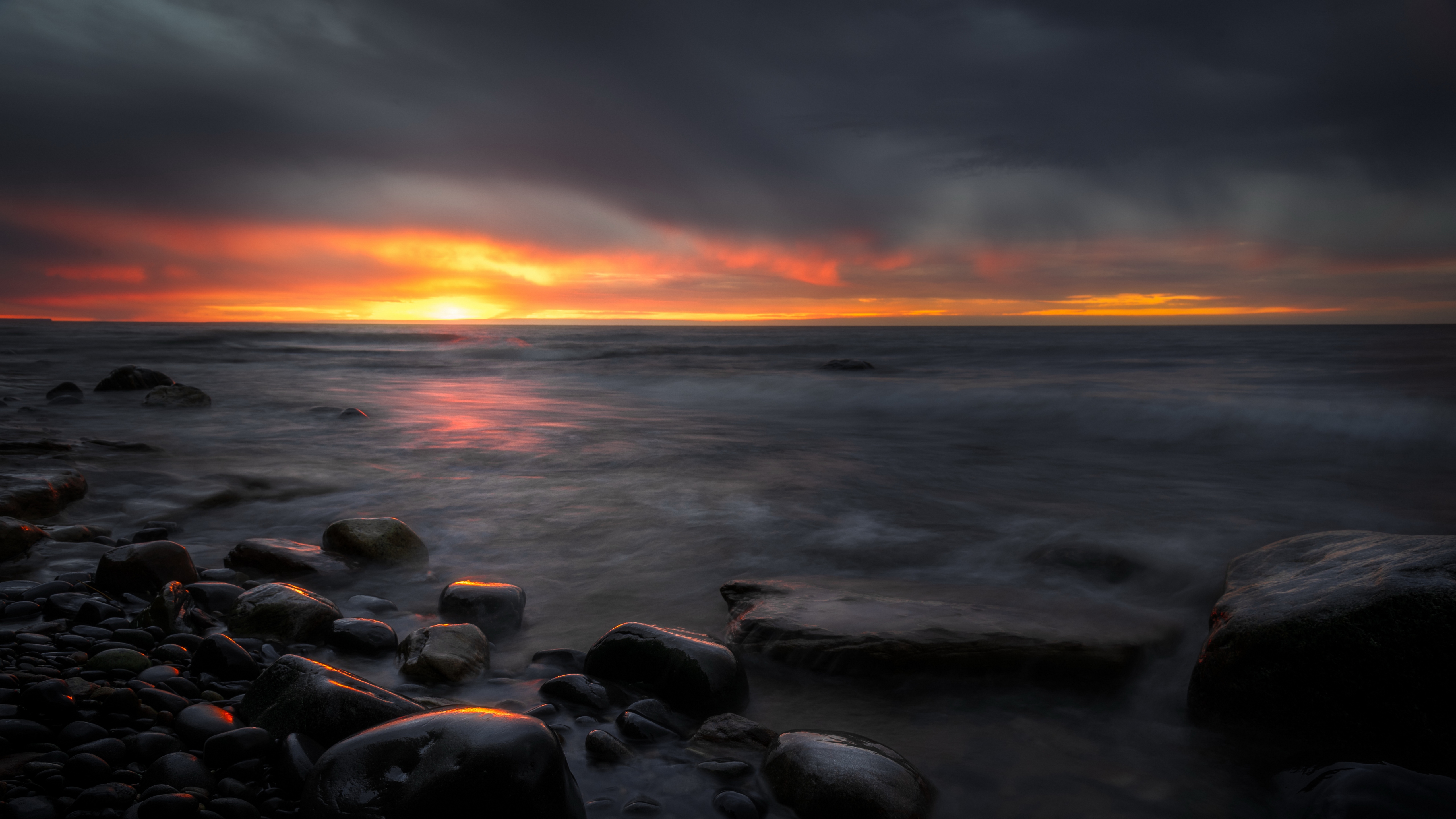 Description: A sunset over the ocean with rocks and water in the foreground and a dark sky in the background.