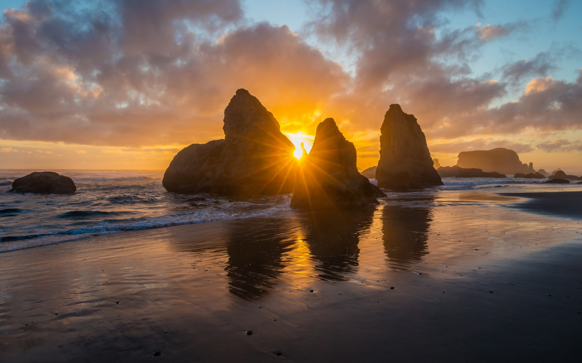 Description: A sunset over the ocean with rocks in the foreground and a body of water in the background with a few waves coming in.