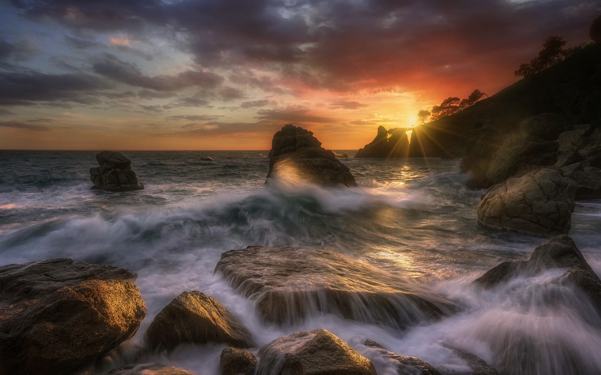 Description: A sunset over the ocean with rocks and water crashing into it and a large rock formation in the foreground.