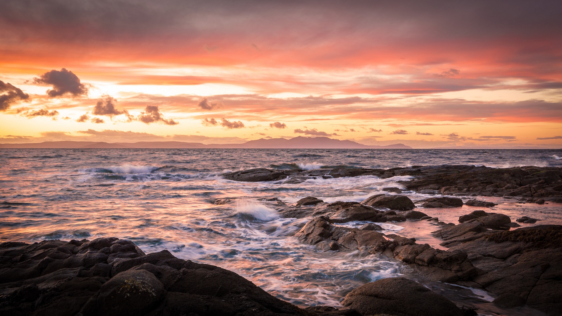 Description: A sunset over the ocean with rocks and waves crashing in front of it and a mountain in the distance.