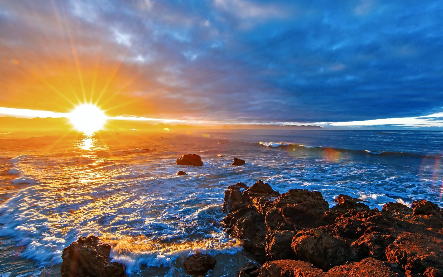 Description: A sunset over the ocean with rocks and waves in the foreground and a person standing on the rocks.