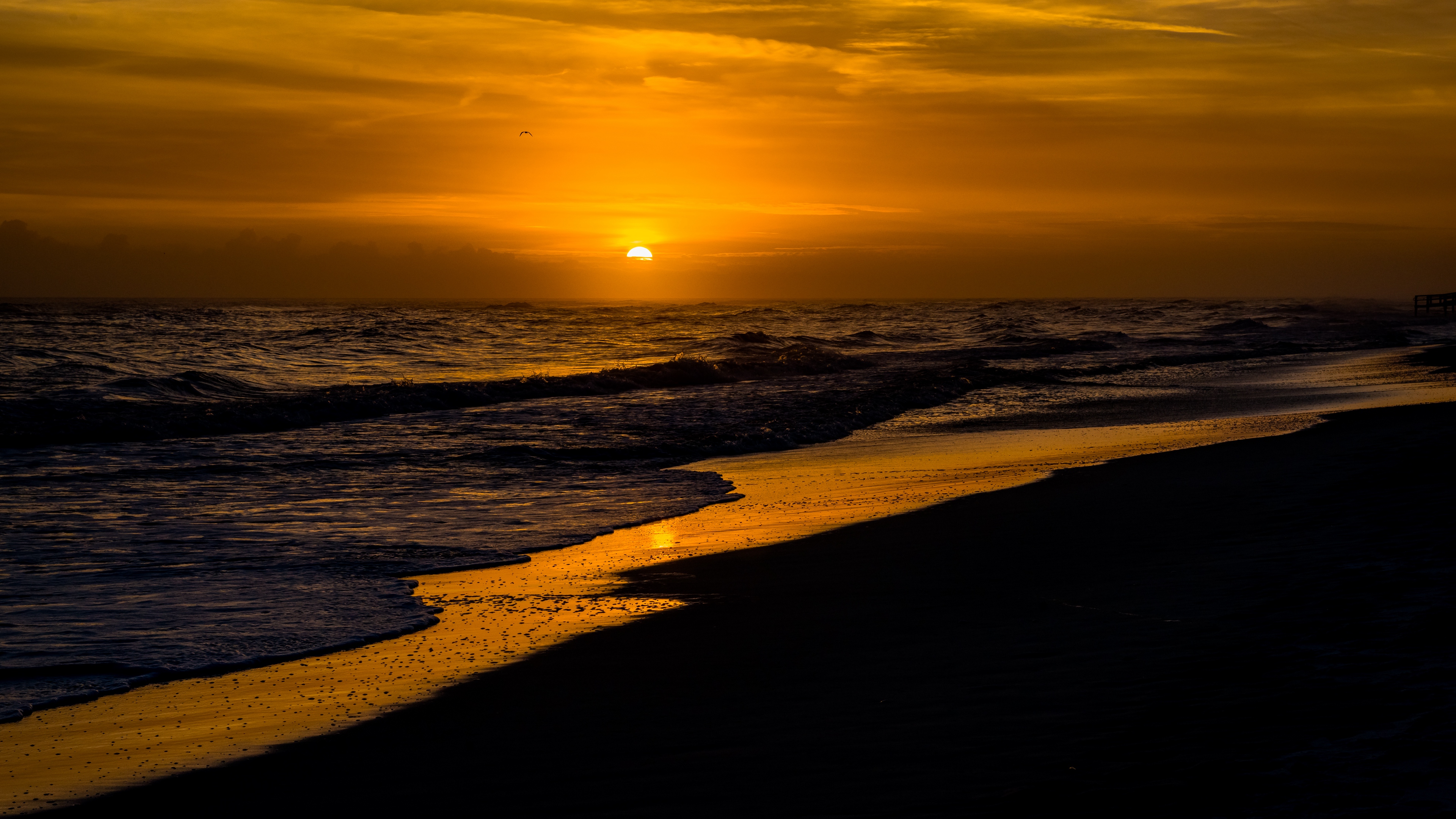 Description: A sunset over the ocean with waves coming in to shore and a person walking on the beach in the distance.