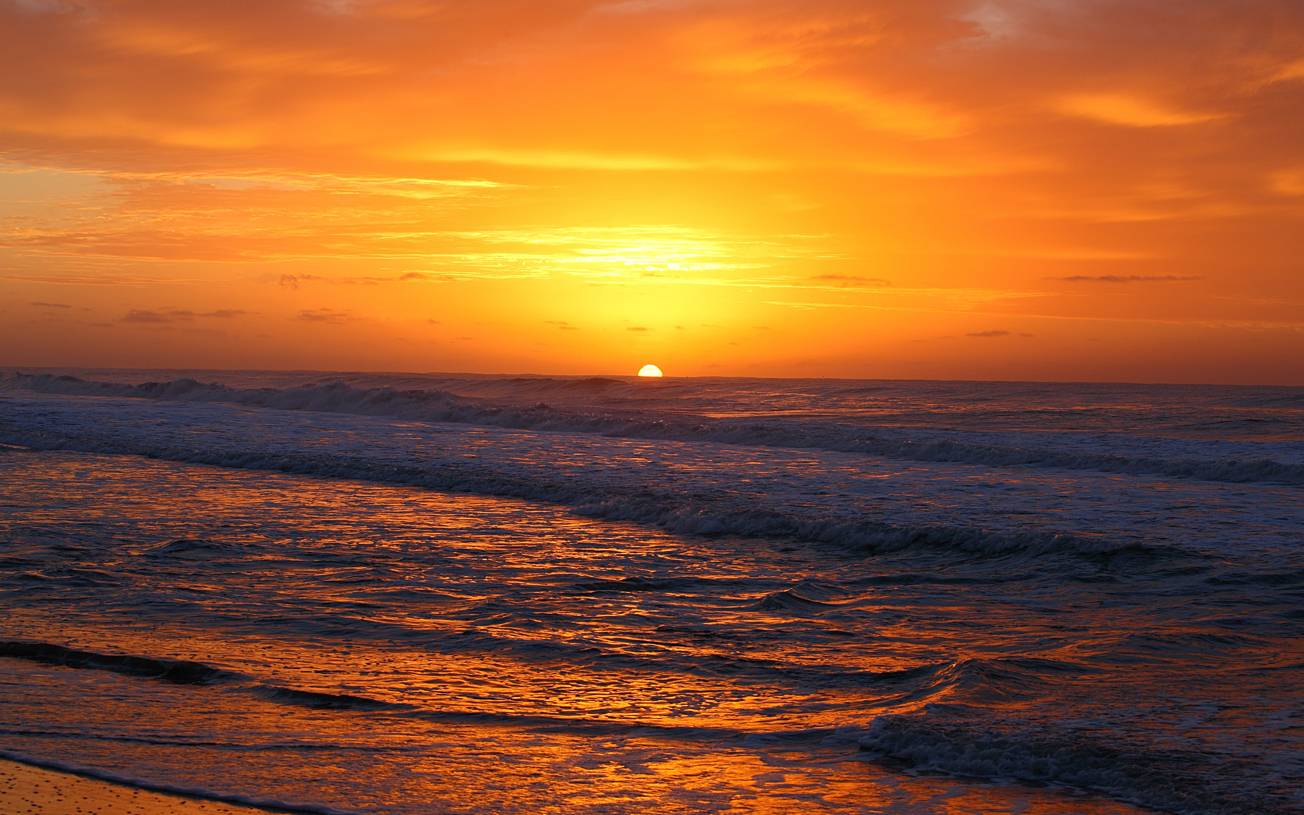Description: A sunset over the ocean with waves coming in to shore and a person walking on the beach with a surfboard.