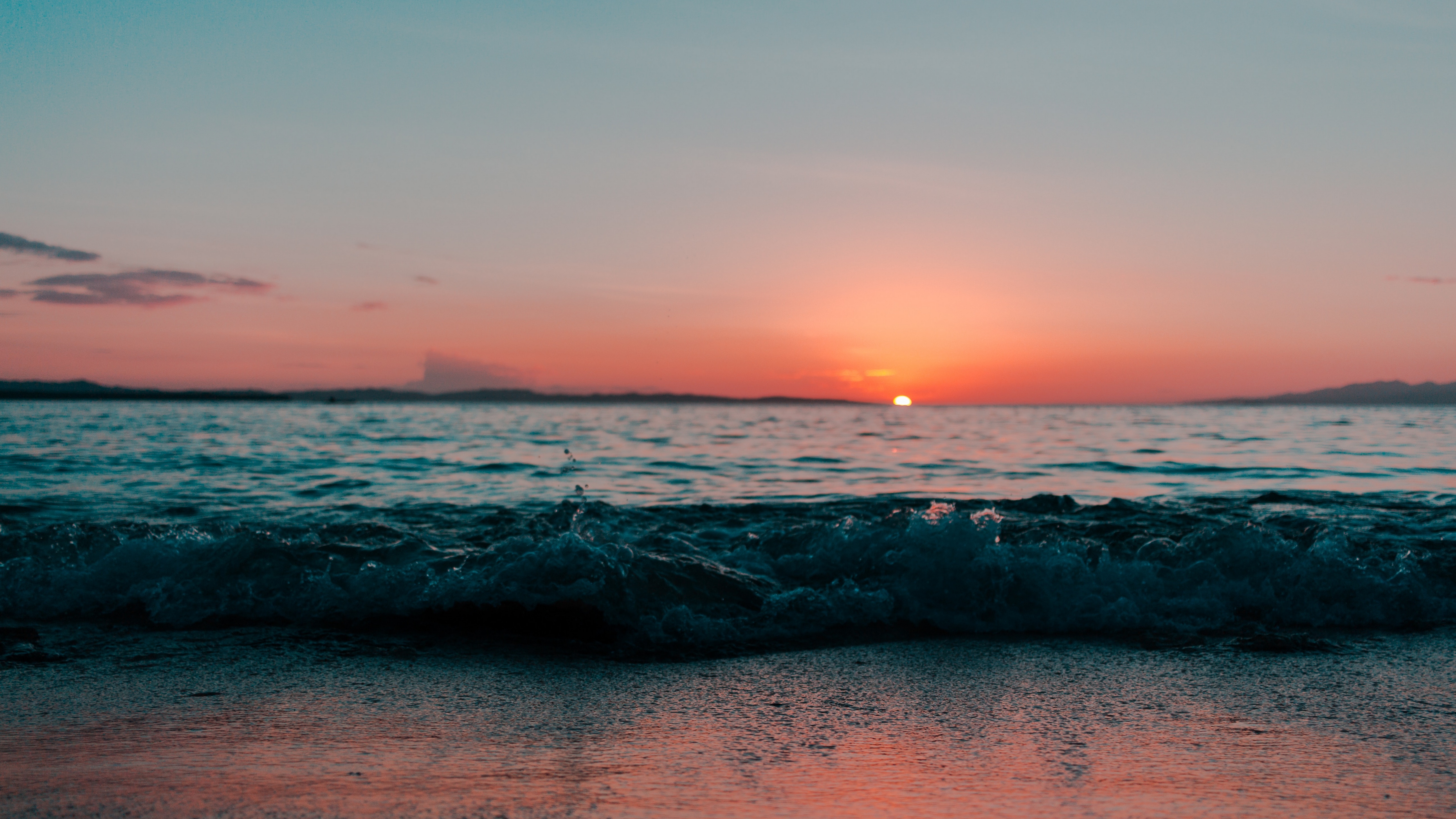 Description: A sunset over the ocean with waves crashing on the beach and a small island in the distance with a red and blue sky.