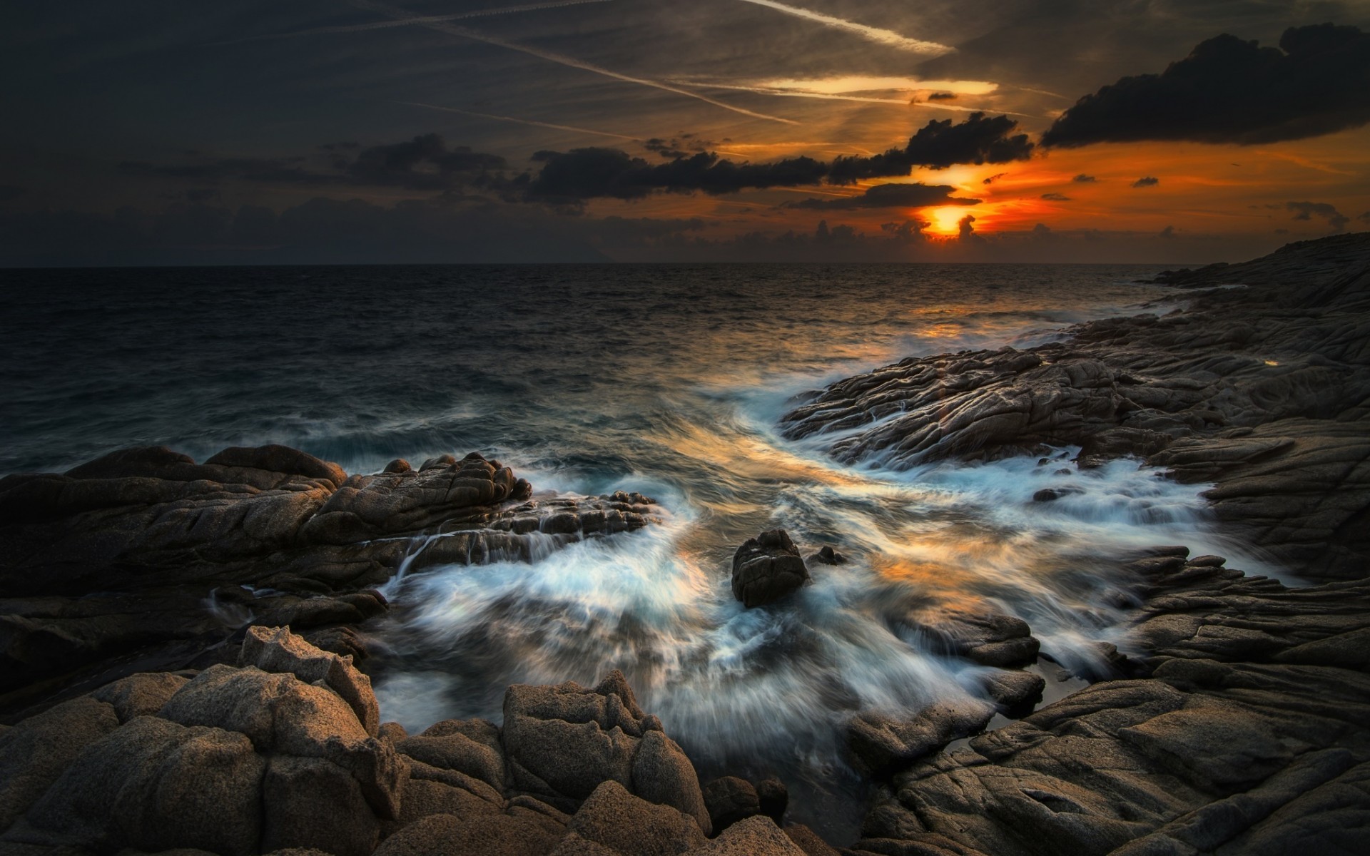 Description: A sunset over the ocean with waves crashing on rocks and a lighthouse in the distance with a cloudy sky.