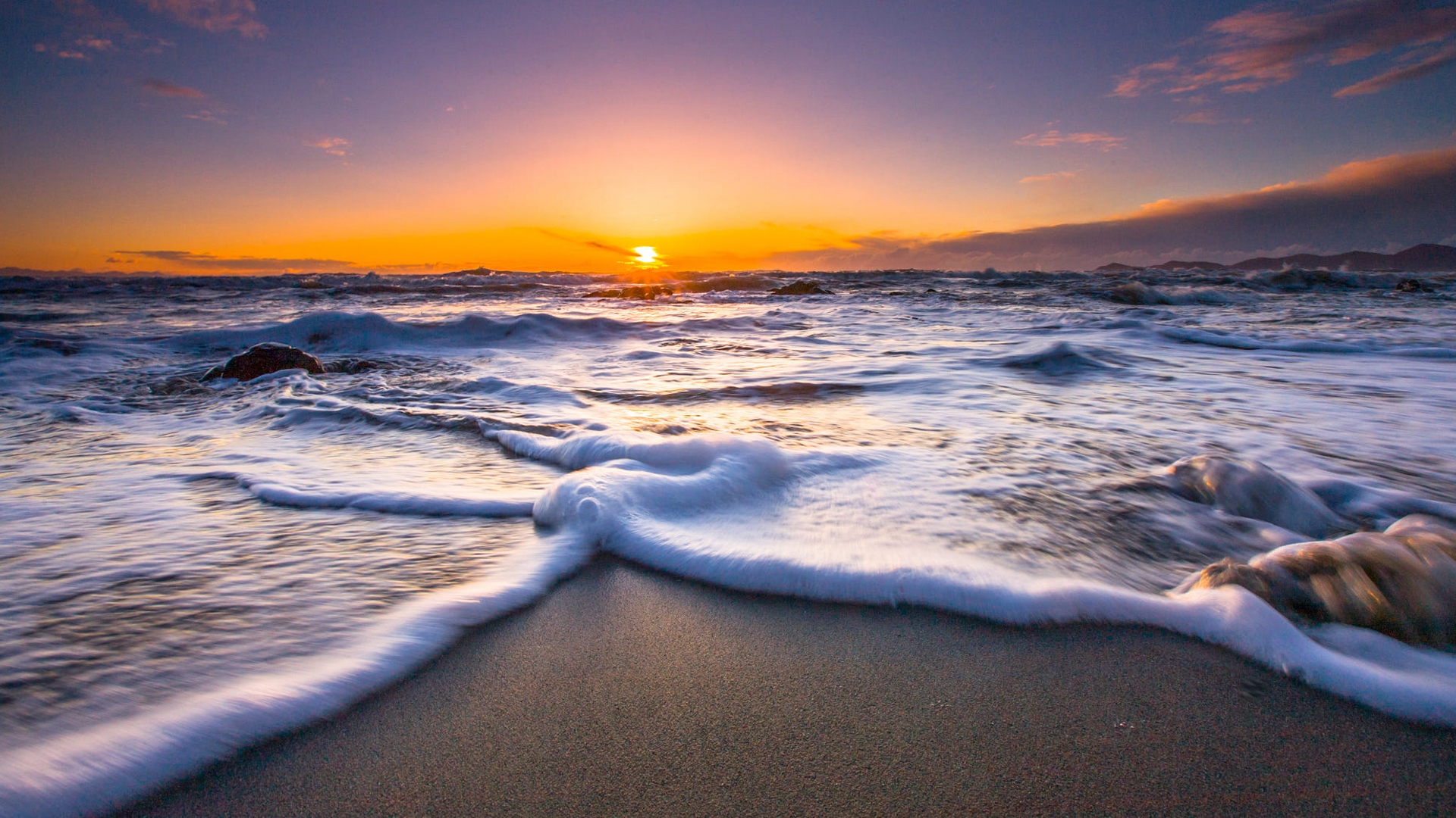 Description: A sunset over the ocean with waves crashing on the beach and a rock in the foreground and a rock in the foreground.