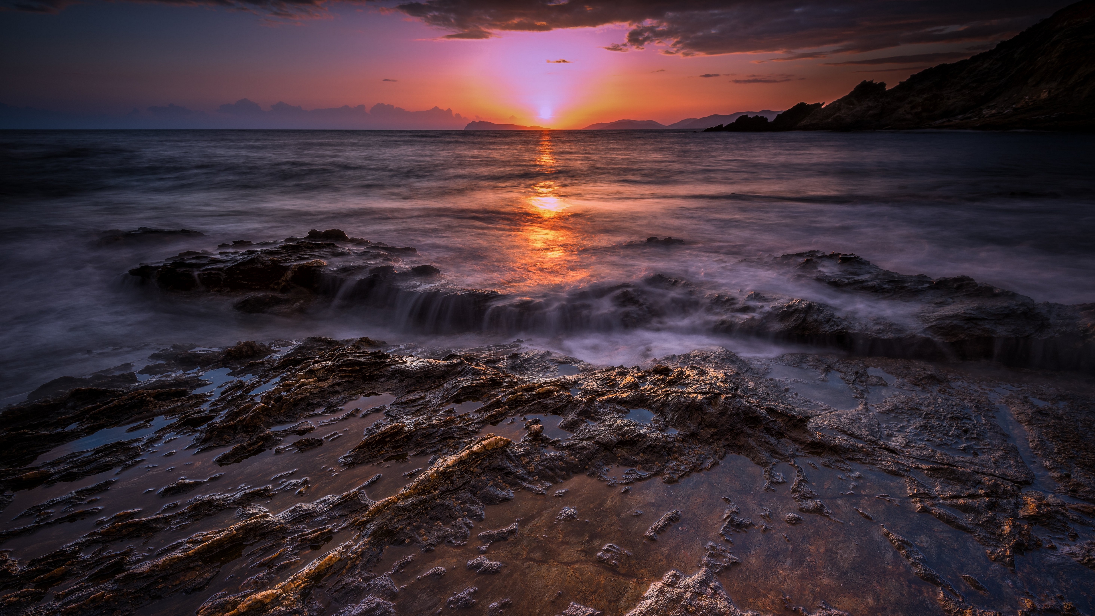 Description: A sunset over the ocean with waves crashing on the rocks and the sun setting in the distance with a mountain in the distance.