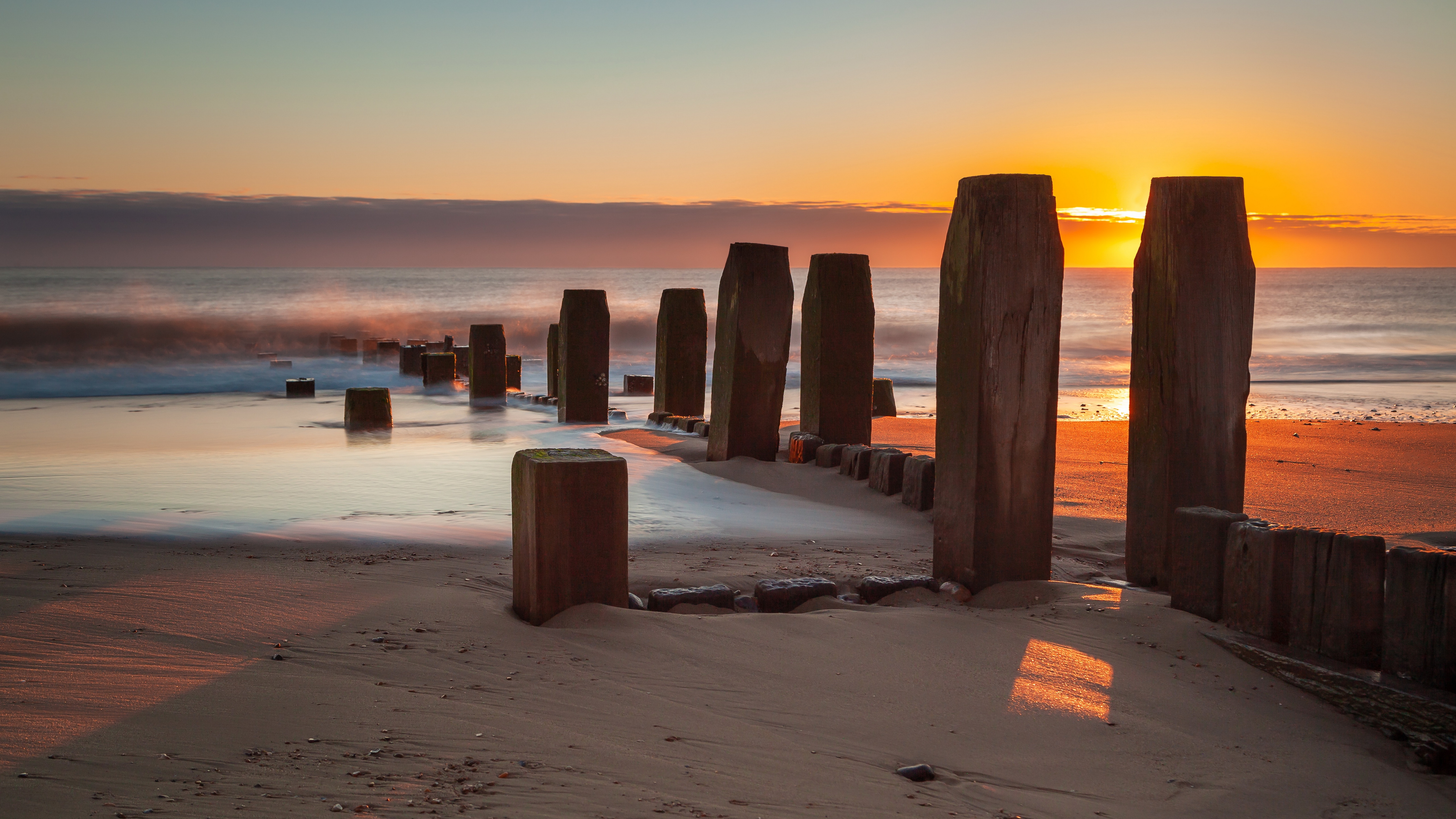 Description: A sunset over the ocean with a row of wooden posts in the sand and a wave coming in from the ocean.