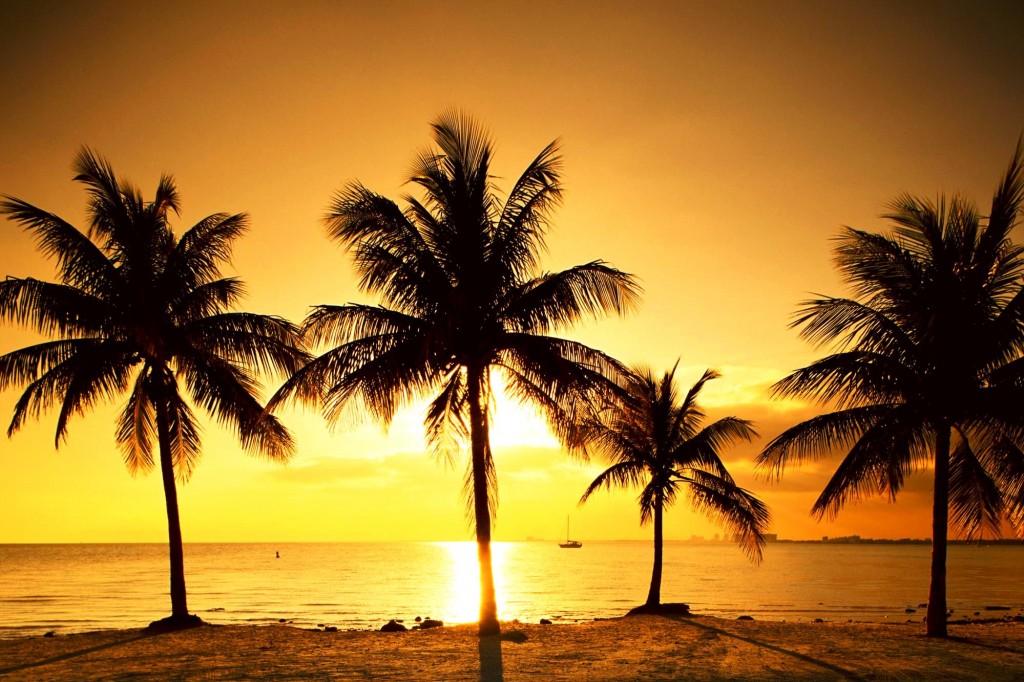 Description: A sunset with palm trees and a boat in the water in the distance.