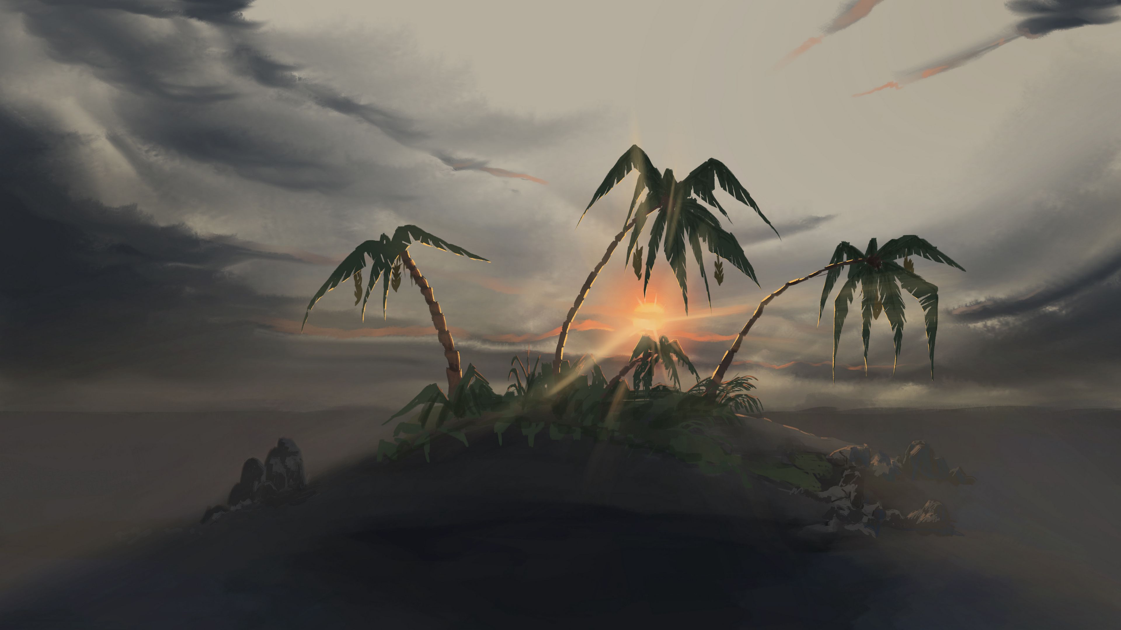 Description: A digital painting of a sunset with palm trees in the foreground and a dark cloud in the background.