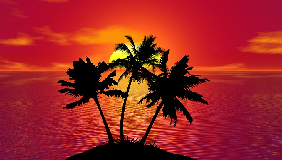 Description: A sunset with two palm trees on an island in the ocean with a red sky and clouds in the background.