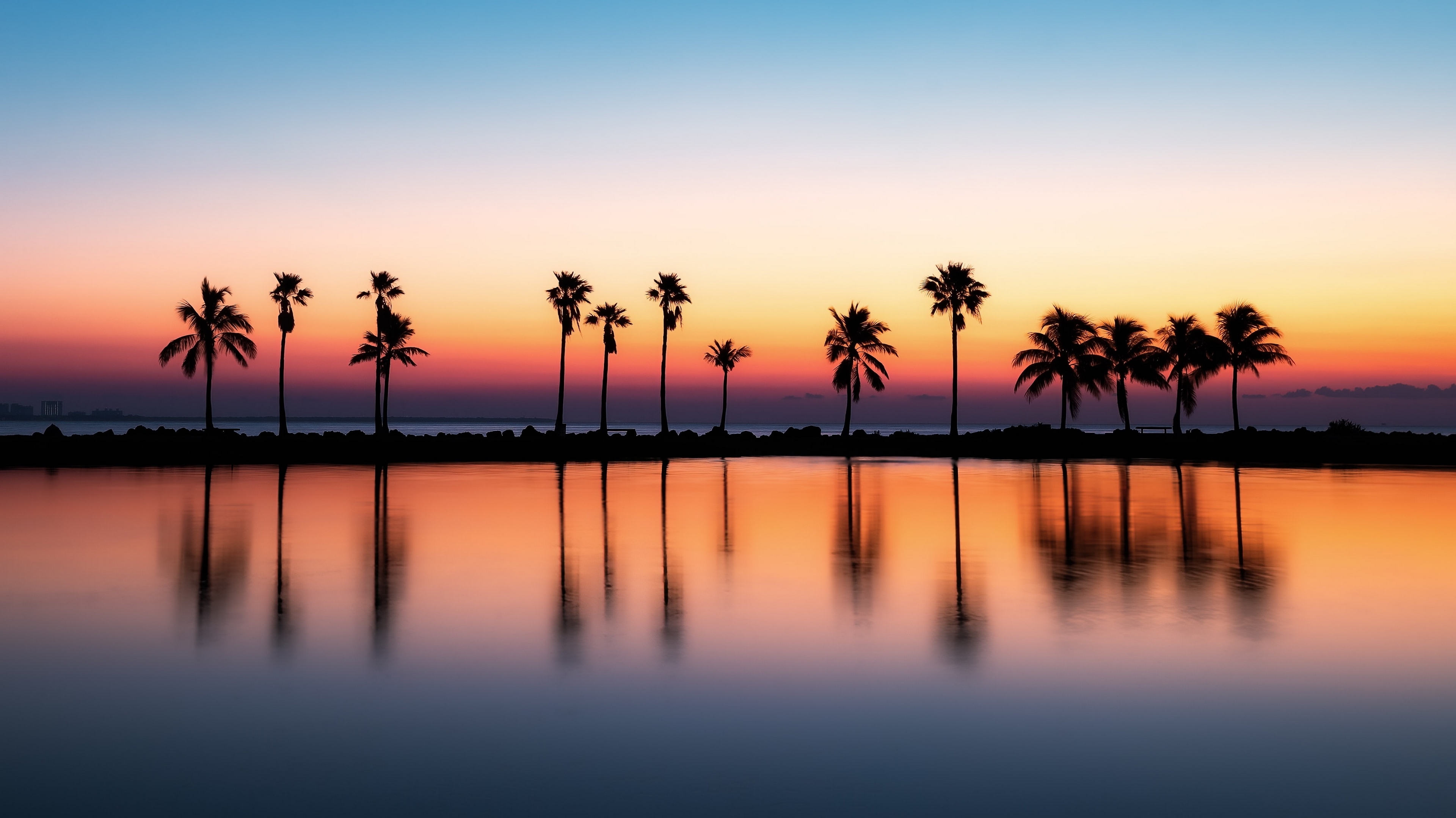 Description: A sunset with palm trees reflecting in the water and a blue sky with a few clouds in the distance.