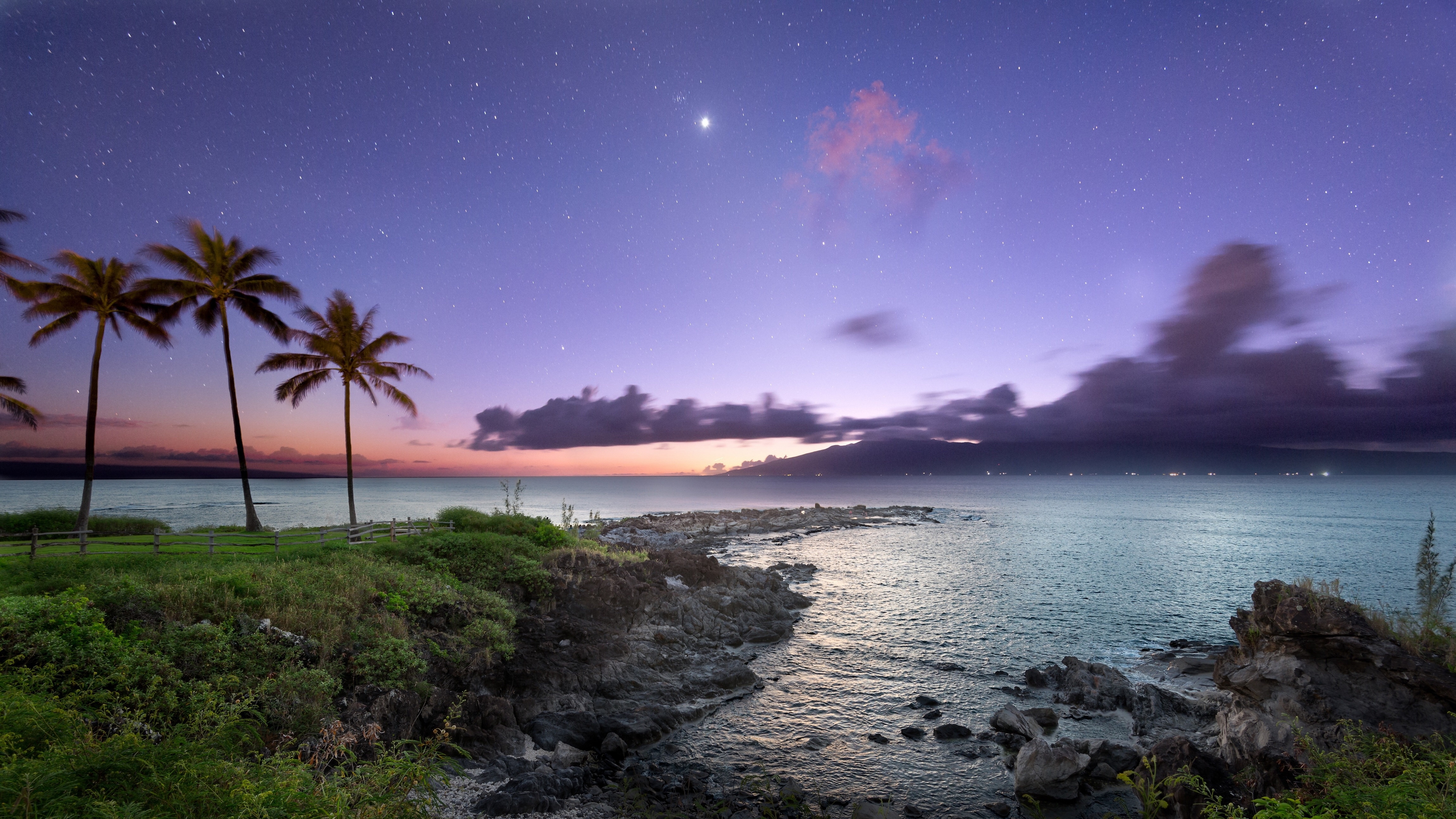 Description: A beautiful sunset with palm trees and a body of water in the foreground and a distant mountain range in the distance.