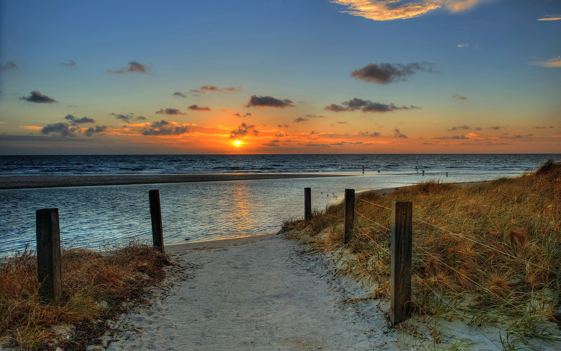 Description: A path leading to the beach at sunset with the sun setting in the distance behind the beach and the ocean.