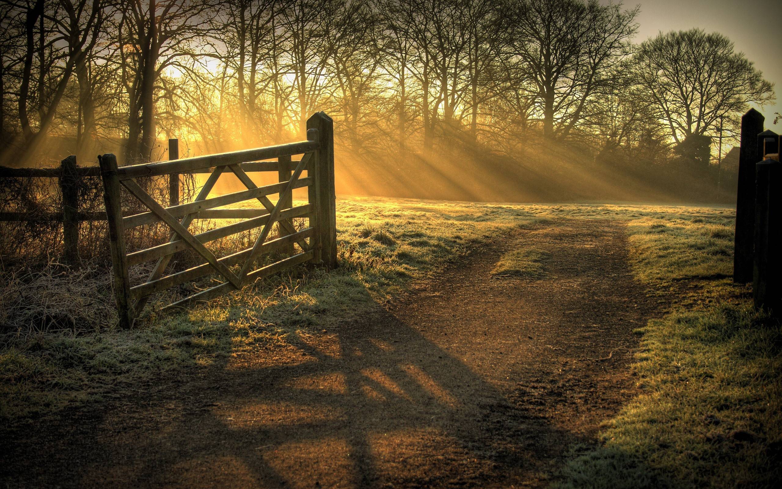 Description: A path leading to a gate in a field with trees in the background and sun shining through the fog.