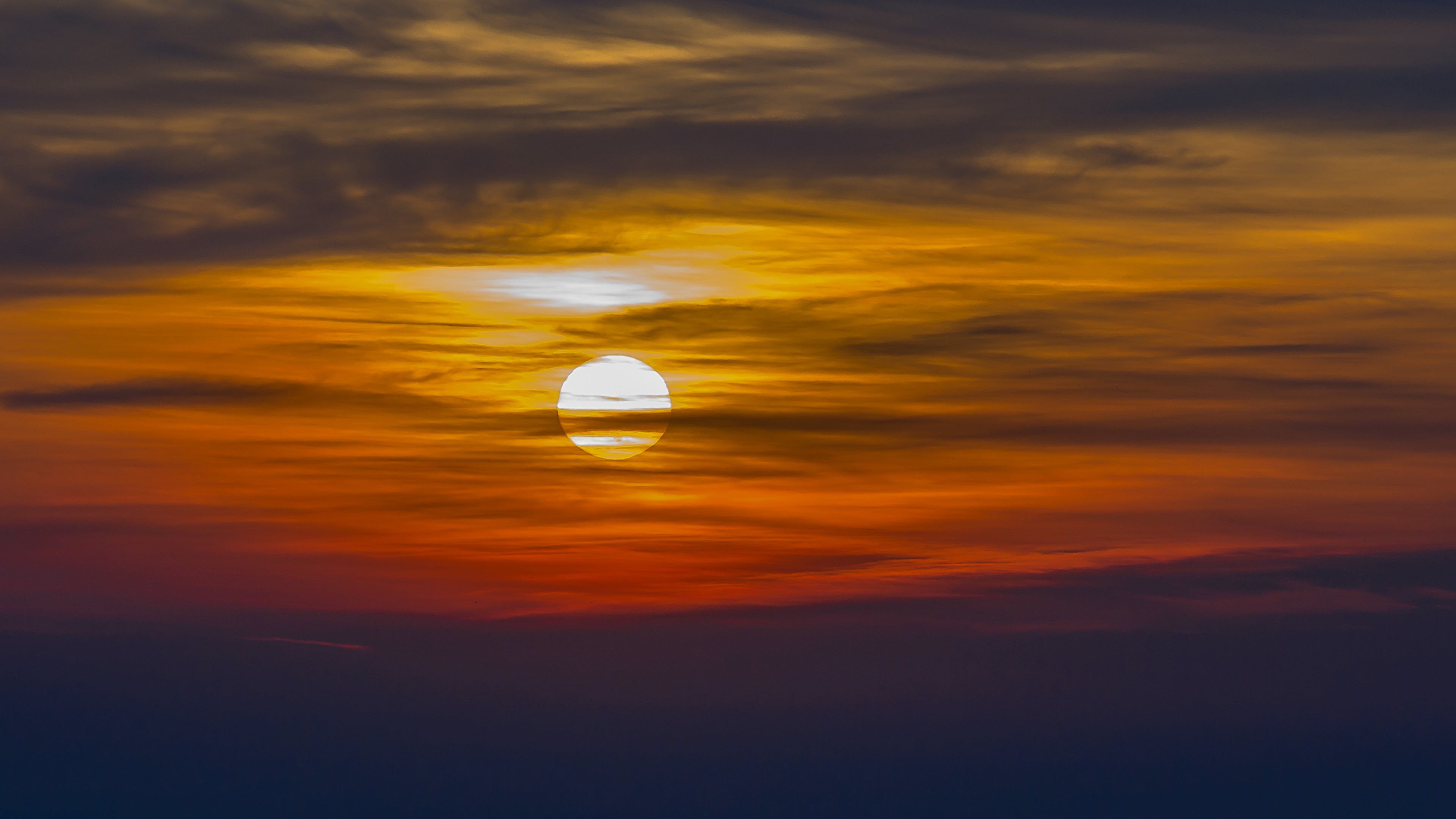 Description: A sunset with a plane flying in the sky and a sun setting in the background with clouds in the sky.