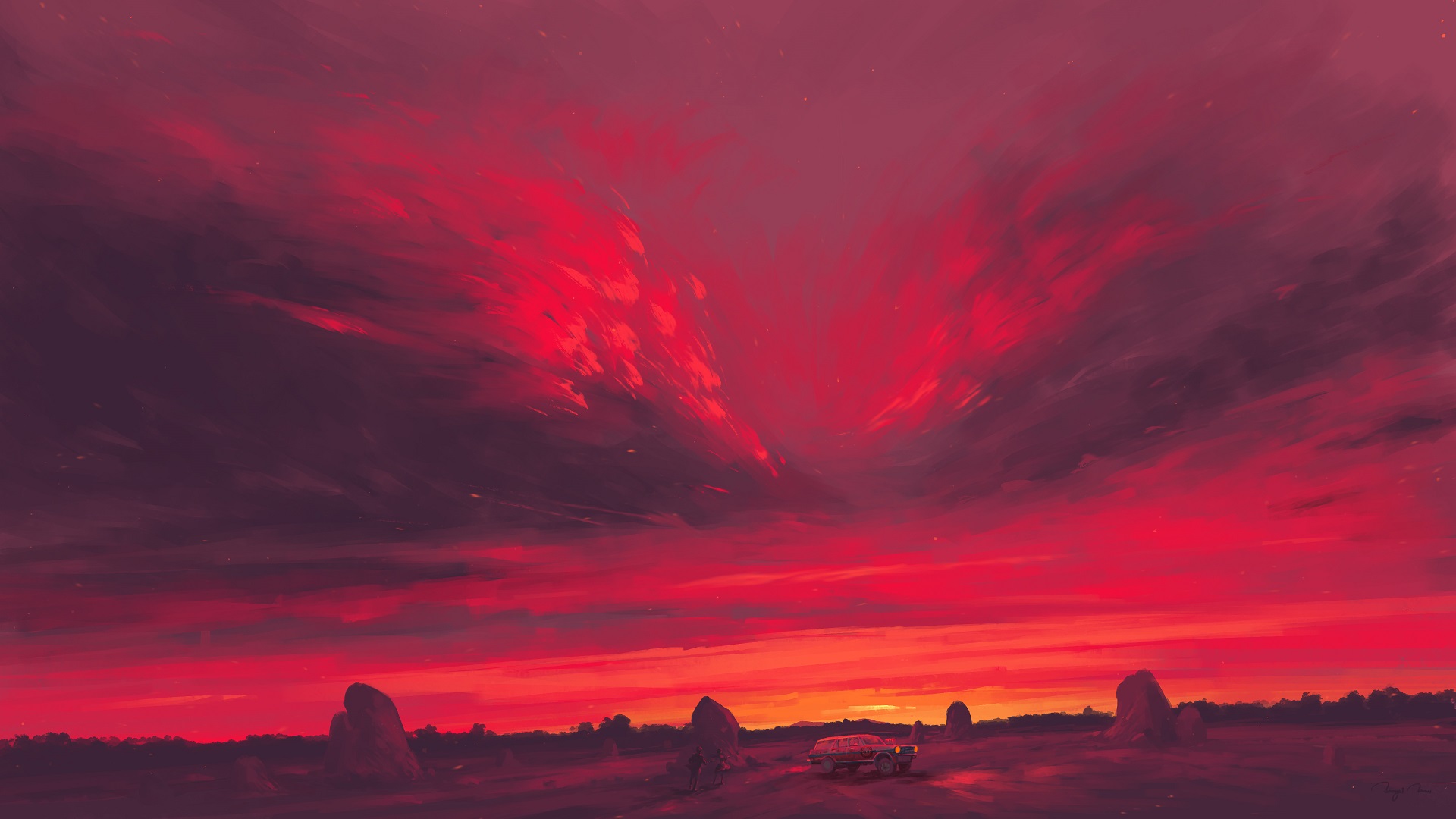 Description: A painting of a sunset with a red sky and clouds over a field of rocks and grass with a car parked in the distance.
