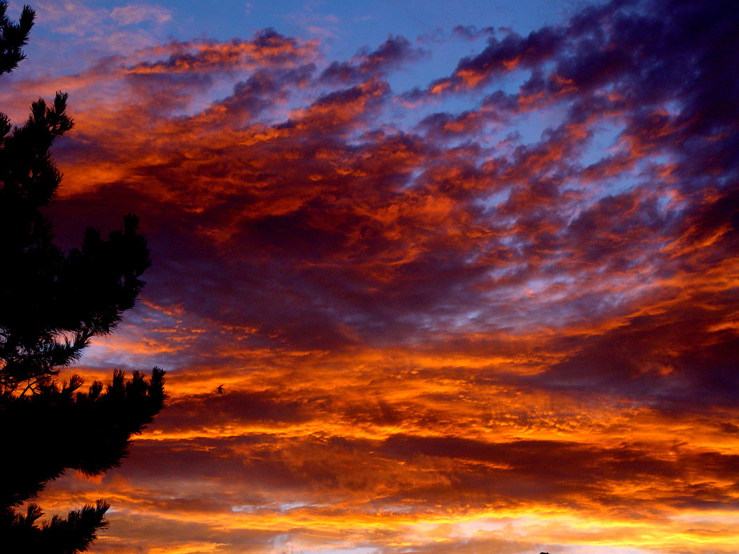 Description: A sunset with a red sky and clouds above a tree line and a bench in the foreground with a bench in the foreground.