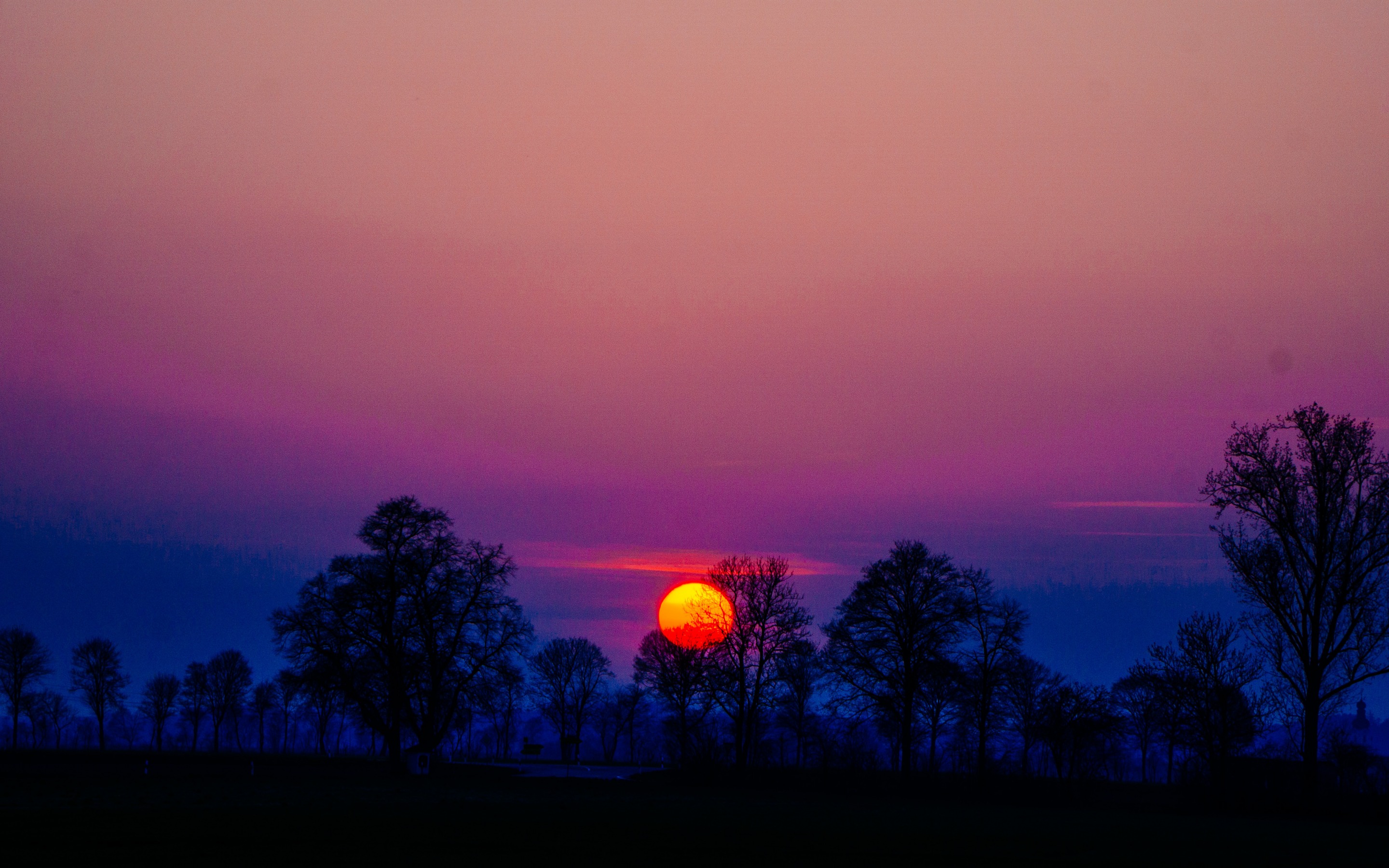 Description: A sunset with a red and yellow sun in the sky and trees in the foreground and a purple sky.