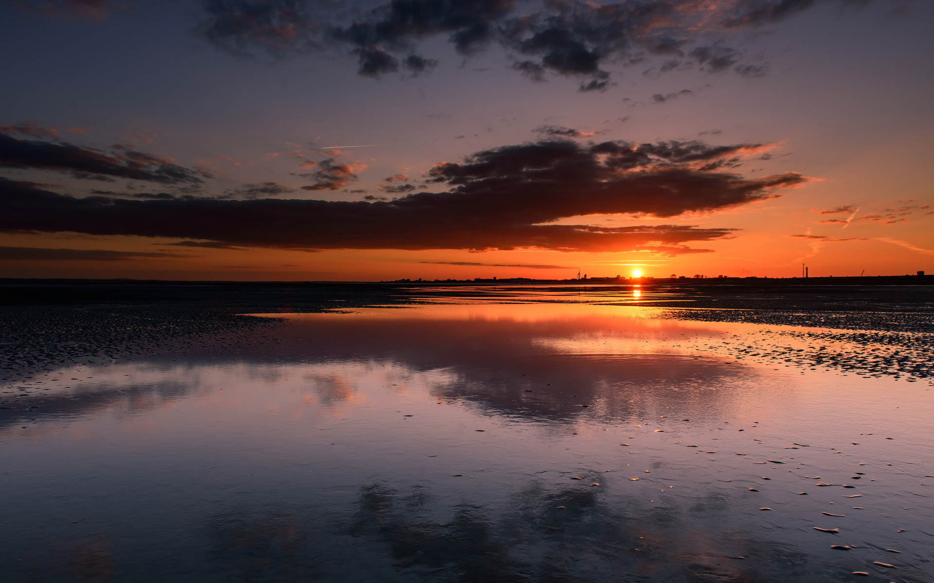 Description: A sunset with a reflection of the sky in the water and clouds in the sky and a beach with a few footprints on the sand.