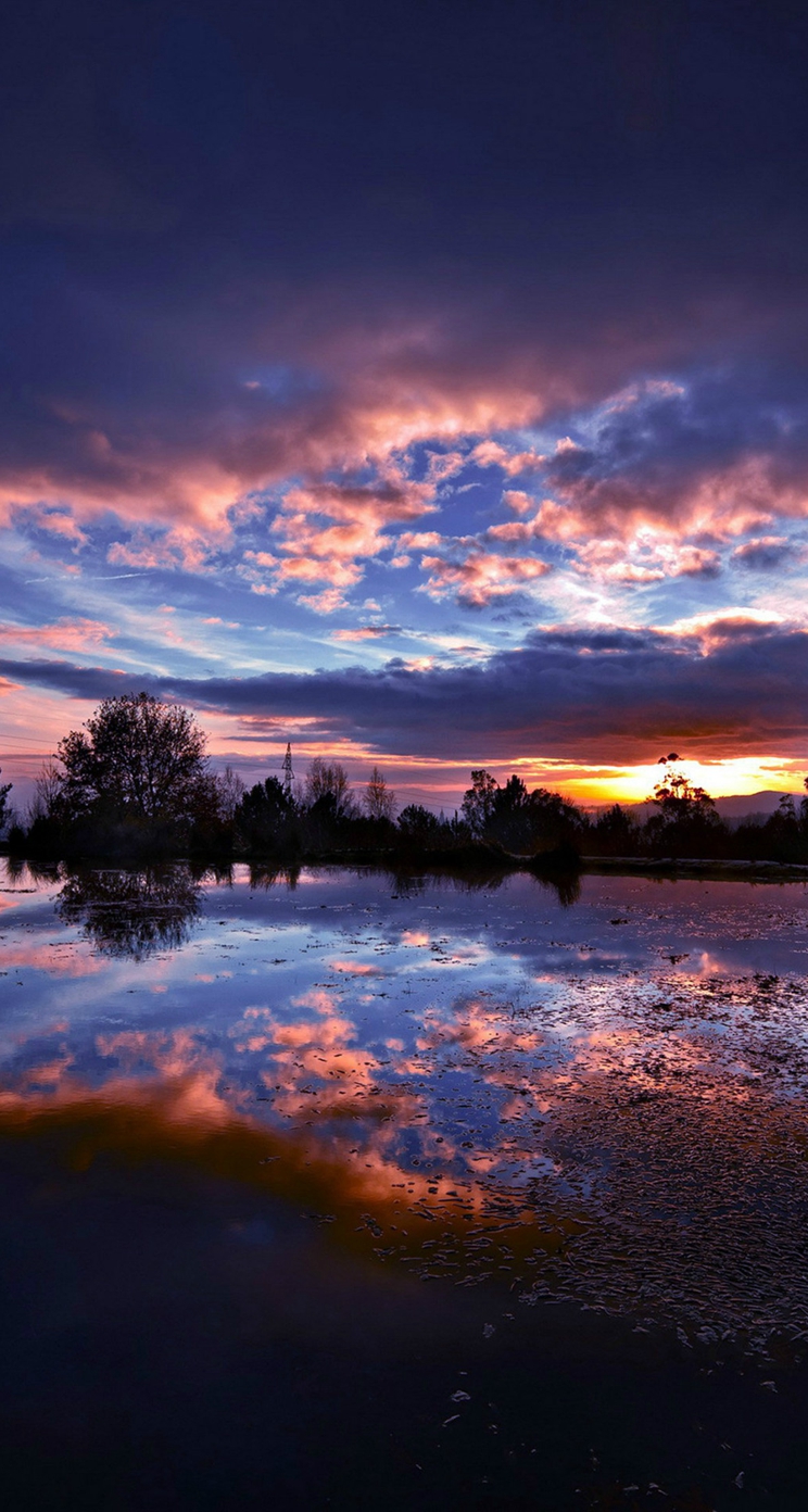 Description: A sunset reflecting in a body of water with trees in the background and clouds in the sky above it.