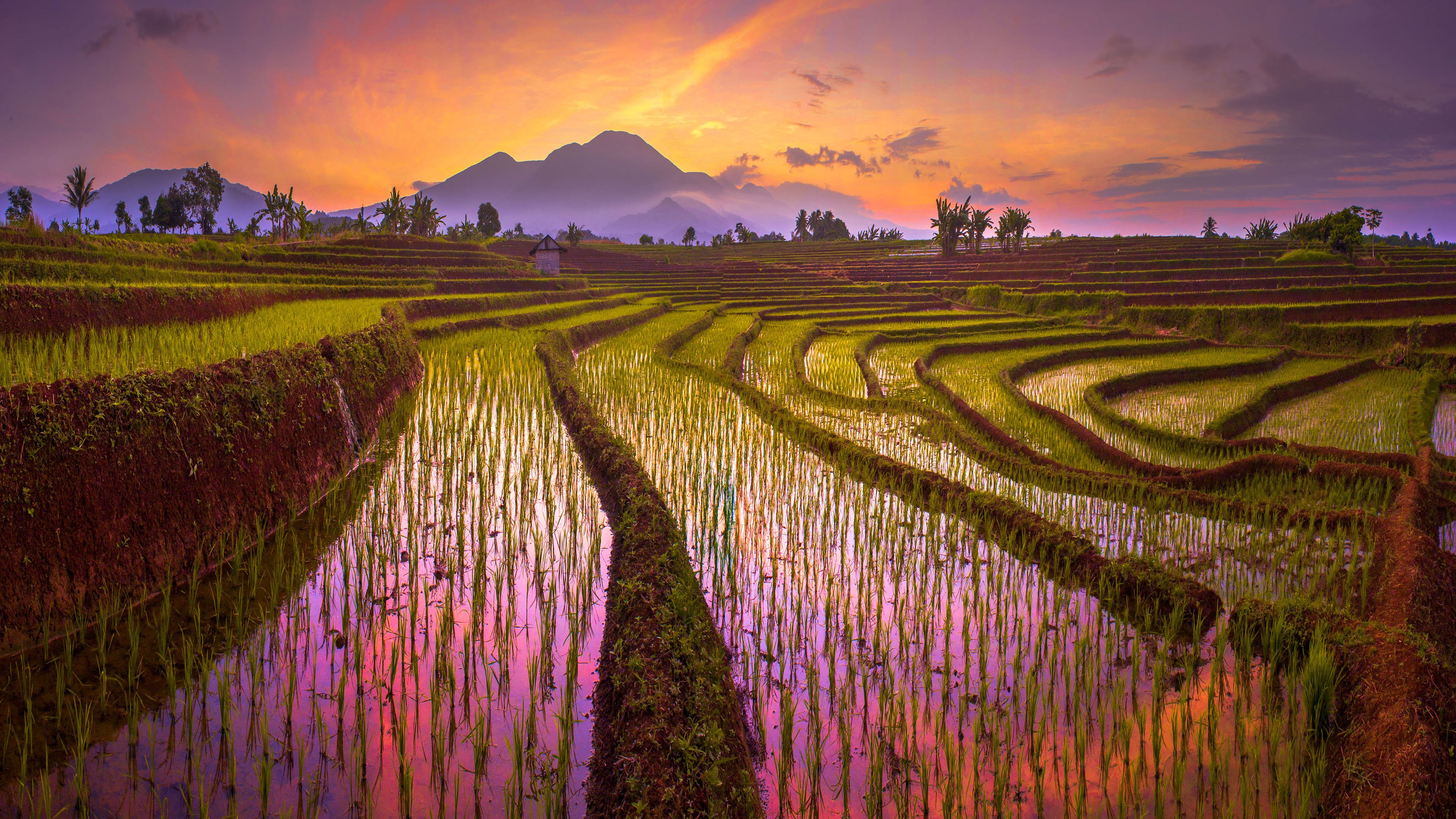 Description: A sunset view of a rice field with a mountain in the background and a person standing in the middle of the field.