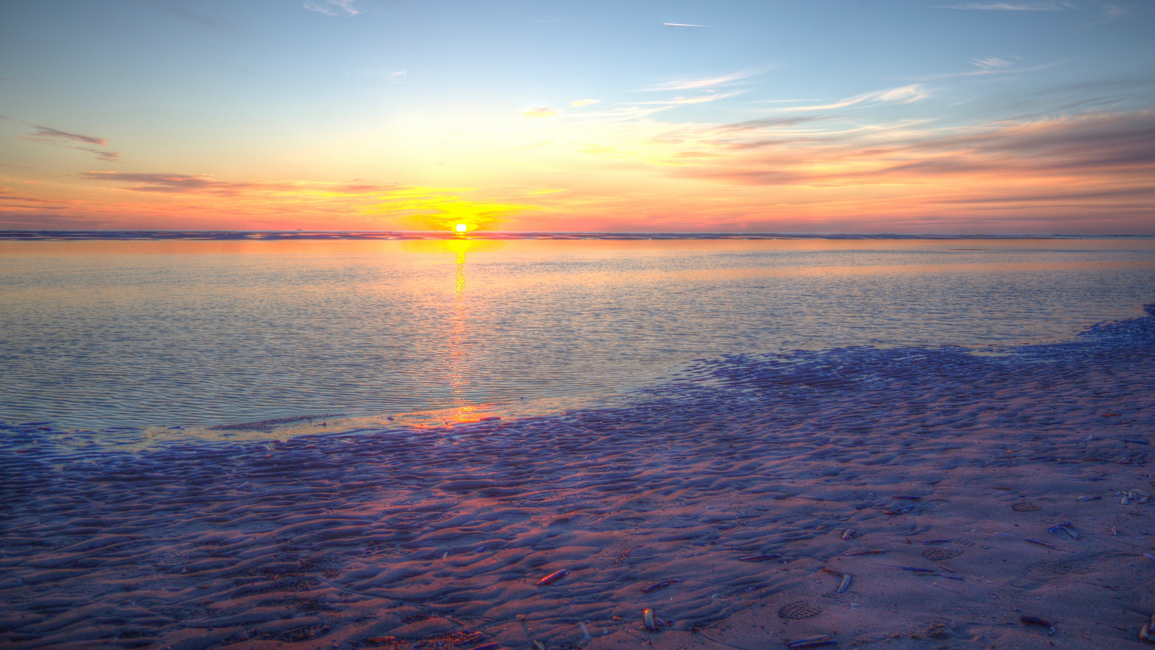 Description: A sunset over a body of water with a beach and sand area in the foreground and a few clouds in the sky.
