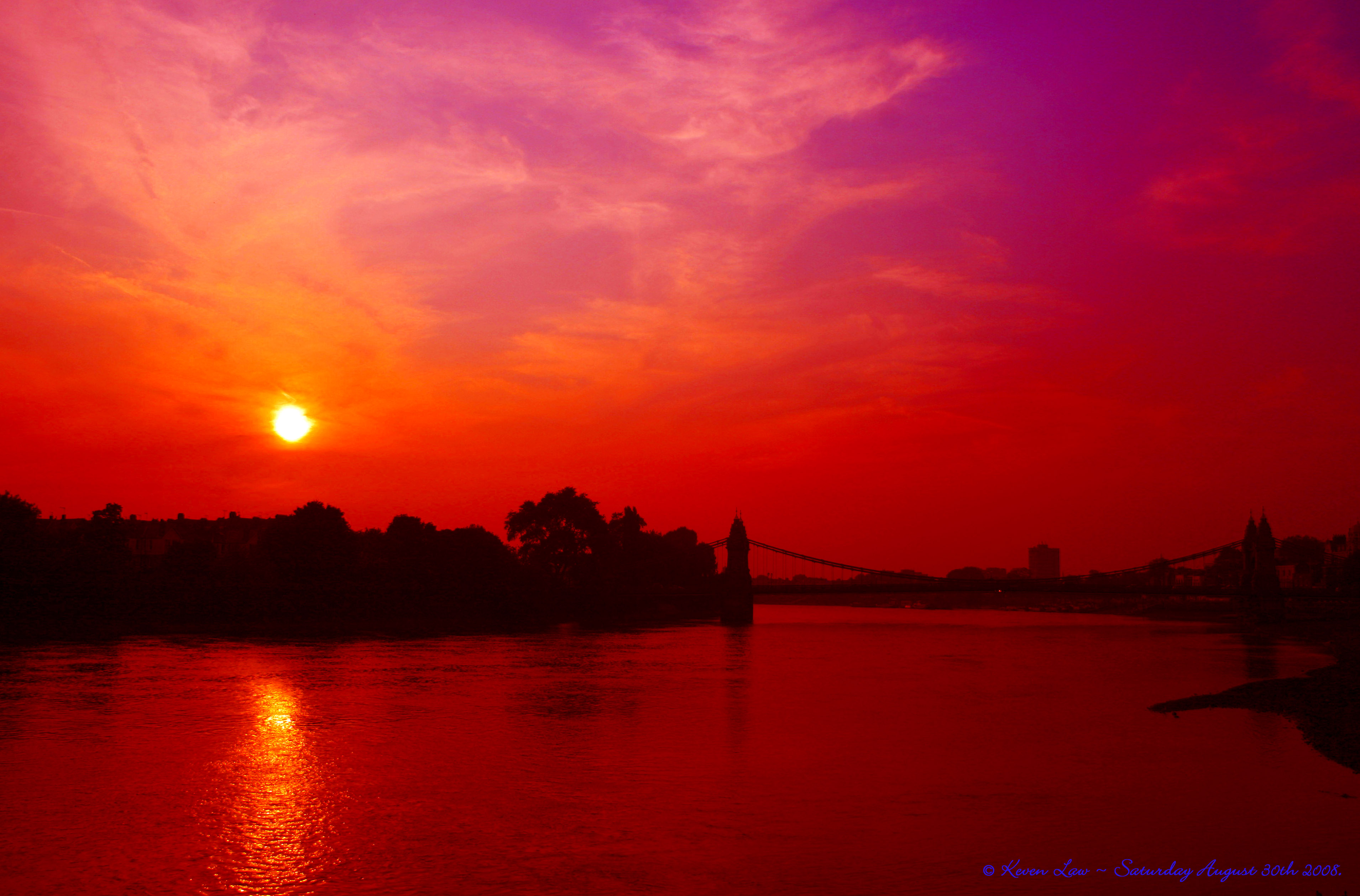 Description: A sunset over a river with a bridge in the background and a red sky with clouds in the background.