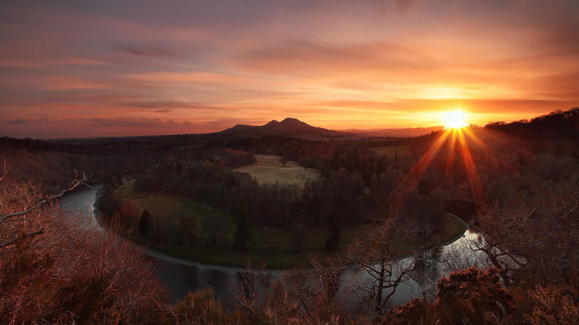 Description: A sunset over a river and a mountain range with trees and grass in the foreground and a river running through the middle.