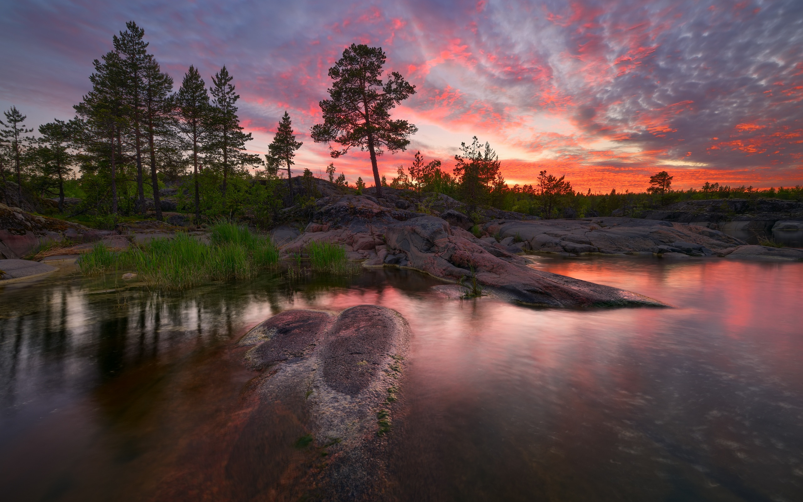 Description: A sunset over a river with rocks and trees in the background and a red sky with clouds above it.