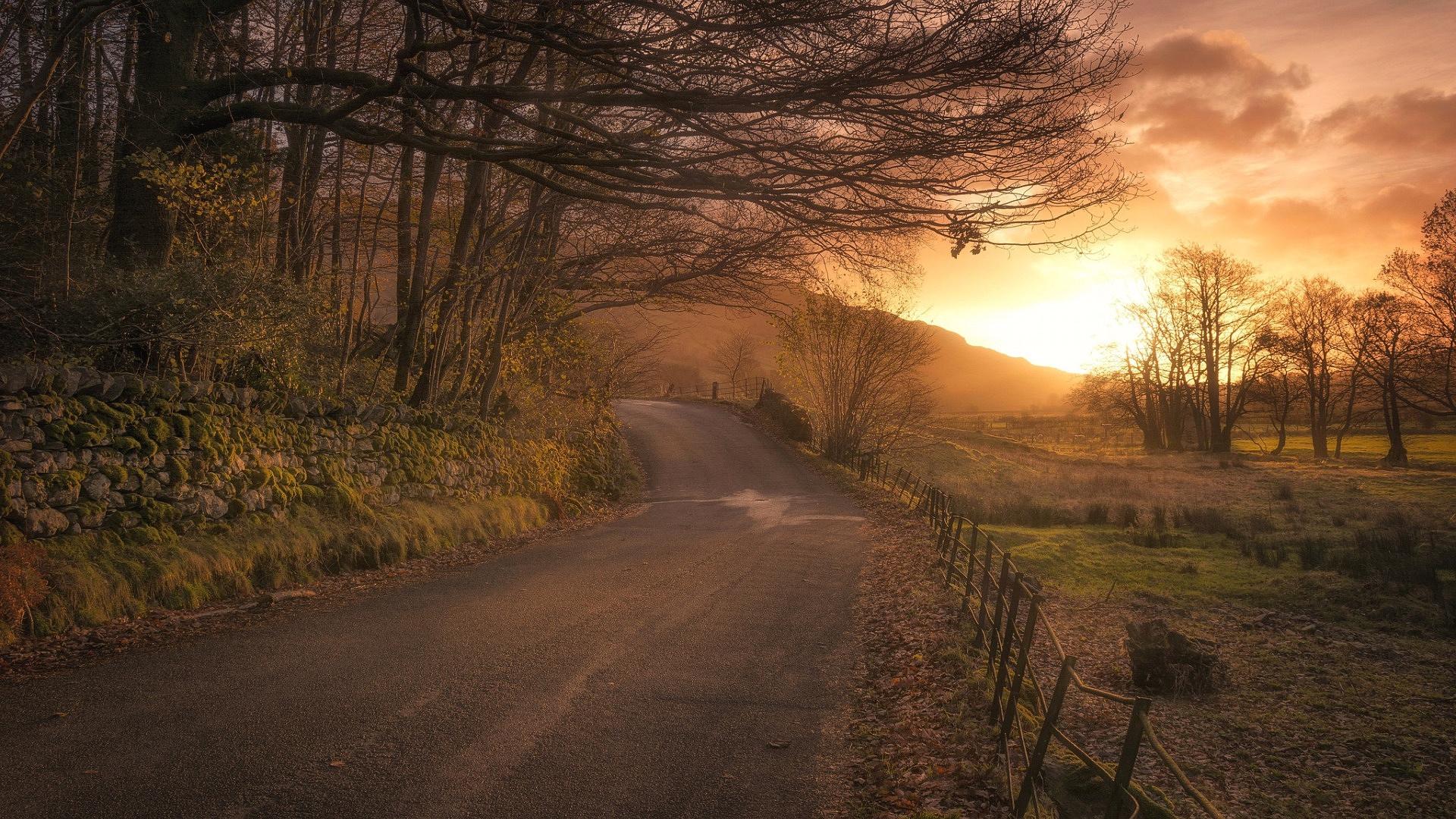 Description: A road with a fence and trees on both sides of it at sunset or dawn with a mountain in the distance.