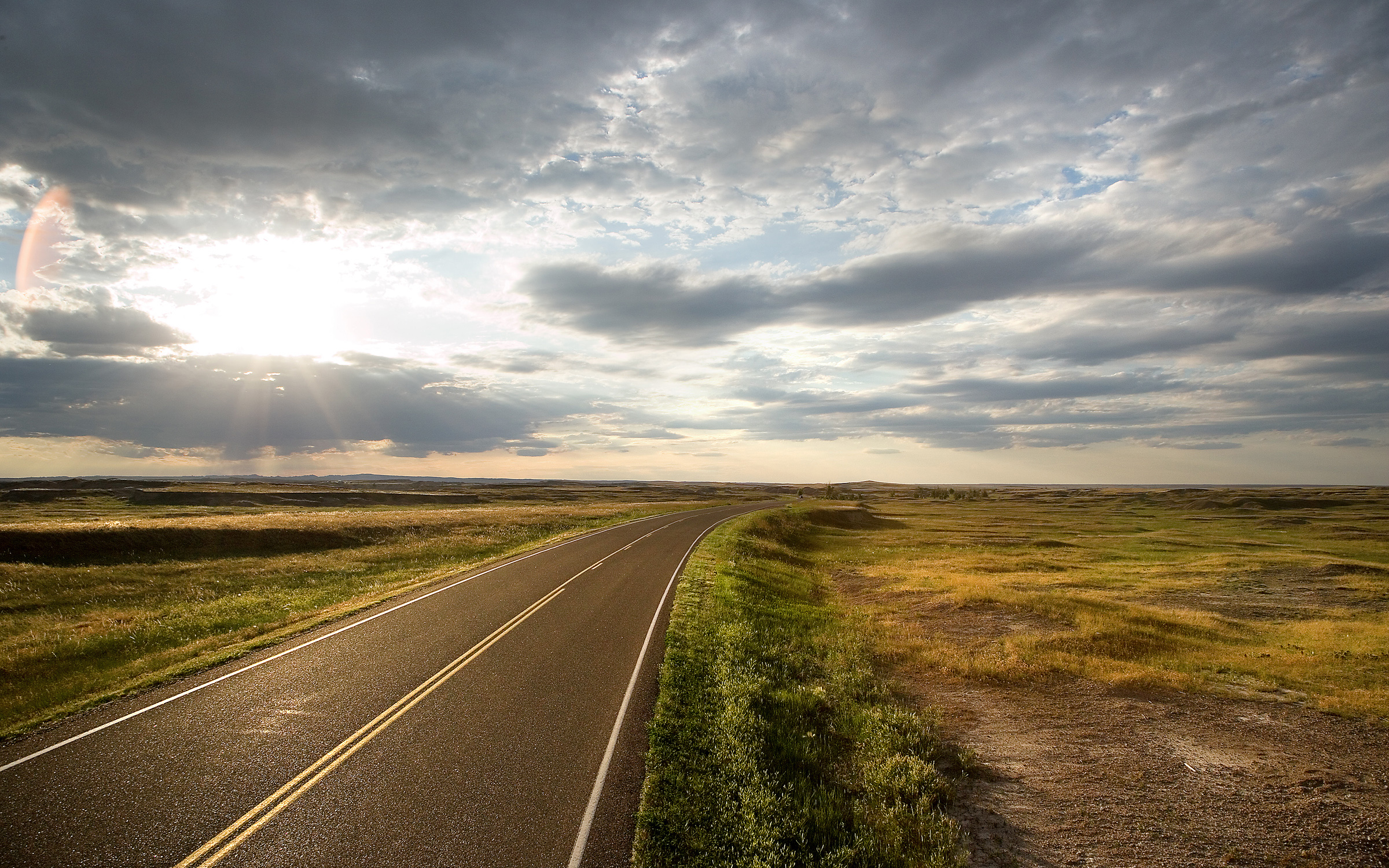 Description: A road going through a field with a sky background and sun shining through the clouds above it and a grassy field below.