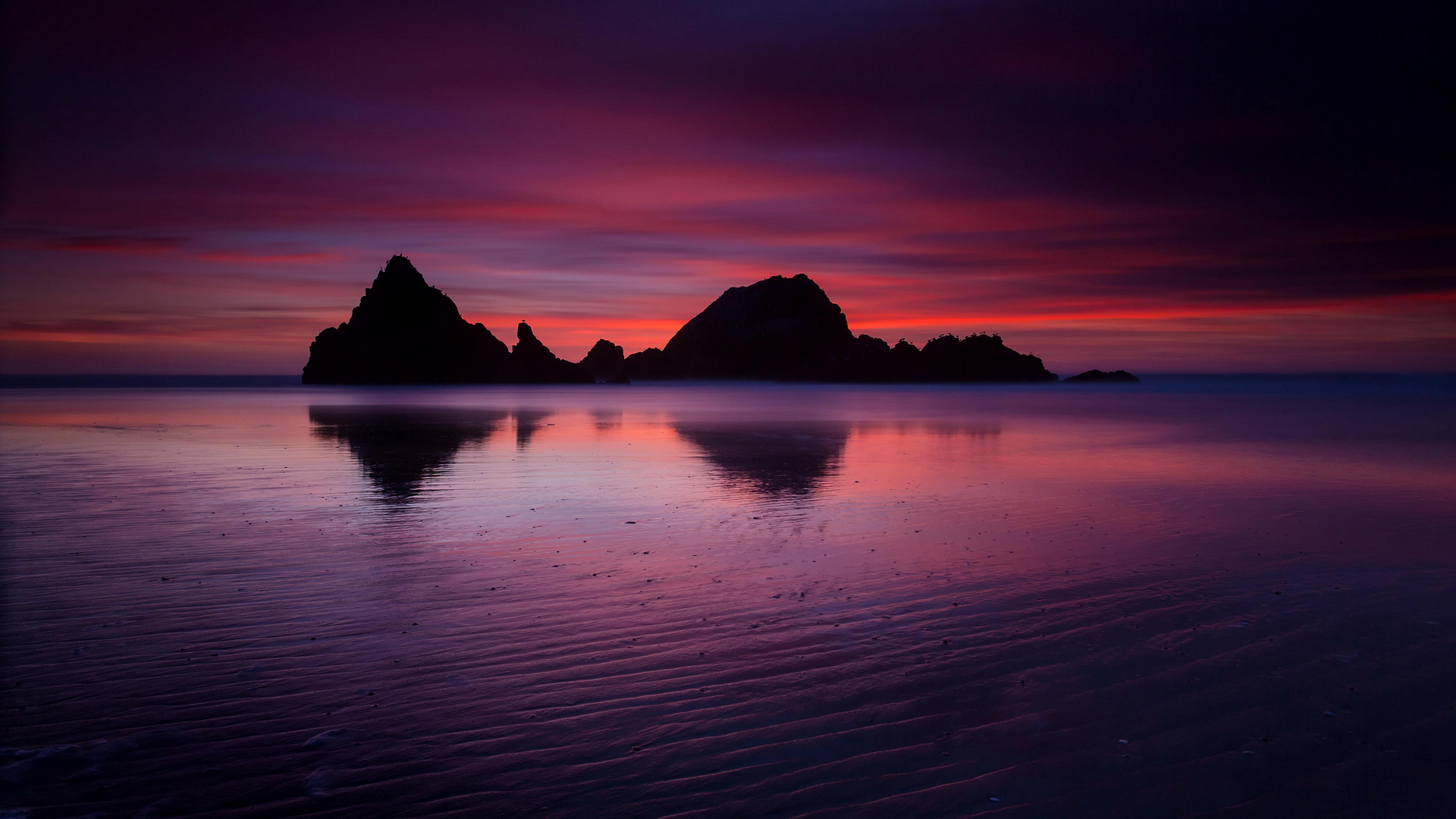 Description: A sunset with a few rocks in the water and a purple sky above it and a few clouds in the sky.